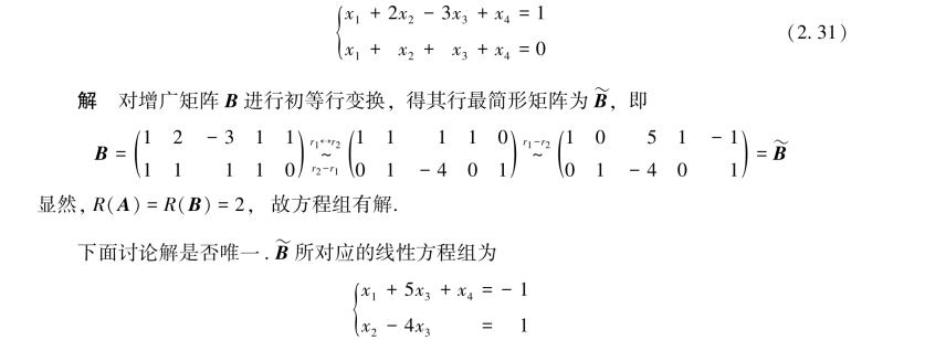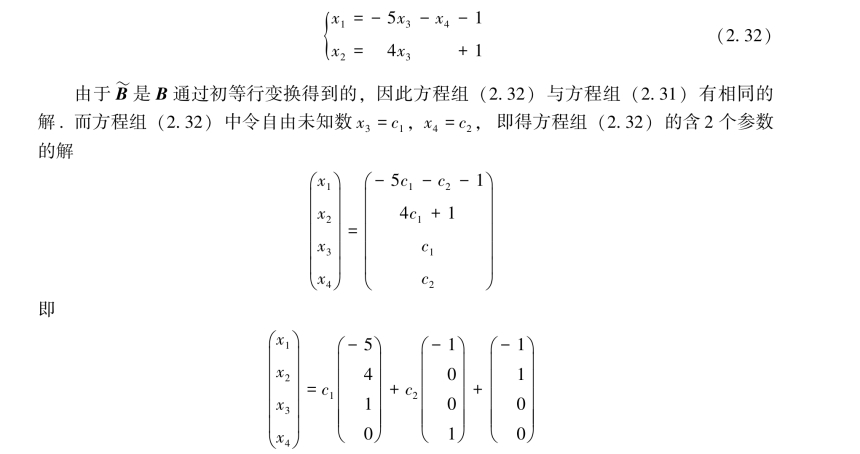 由于参数c1,c2可任意取值,故方程组(2.32)有无穷多个解,进而方程组(2.31)有无穷多个解.