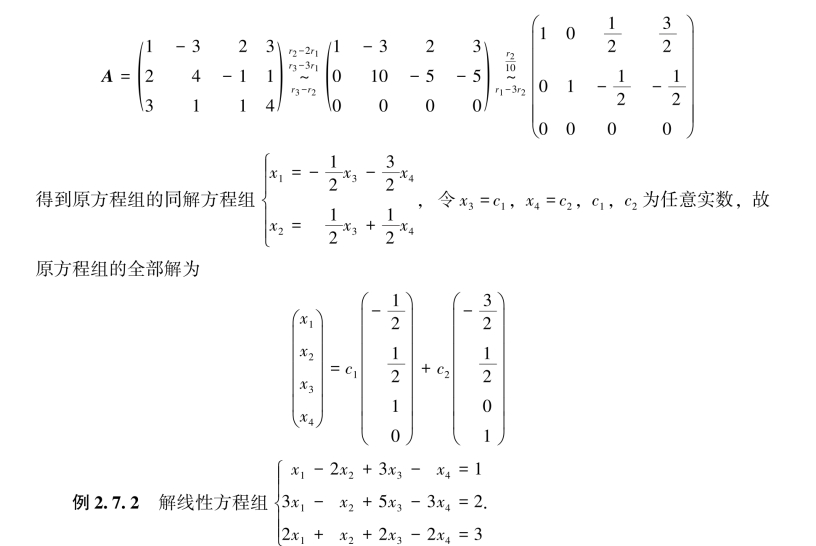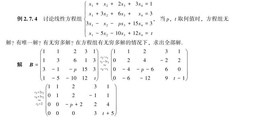 定理2.7.2 n元非齐次线性方程组Am×nx=b有解的充分必要条件:它的系数矩阵A的秩与增广矩阵B的秩相等,即R(A)=R(B).