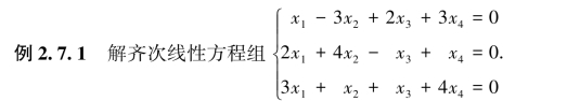 定理2.7.1 n元齐次线性方程组Am×nx=0有非零解的充要条件是系数矩阵的秩R(A)<n.