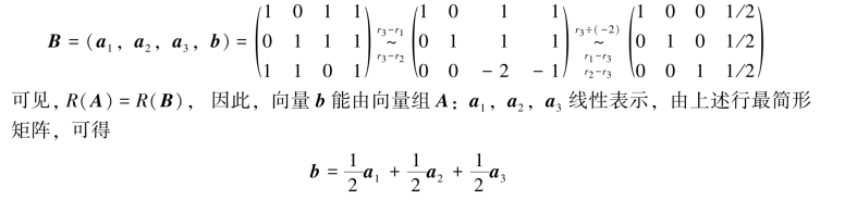 定理3.2.1 向量b能由向量组A:a1,a2,…,an线性表示的充分必要条件是矩阵A=(a1,a2,…,an)的秩等于矩阵B=(a1,a2,…,an,b)的秩.