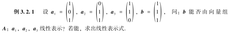 解 判断b能否由向量组A:a1,a2,a3线性表示,即判断非齐次线性方程组b=k1a1+k2a2+k3a3是否有解,由定理3.2.1知,即需验证A=(a1,a2,a3)与B=(A,b)的秩是否相等.易知
