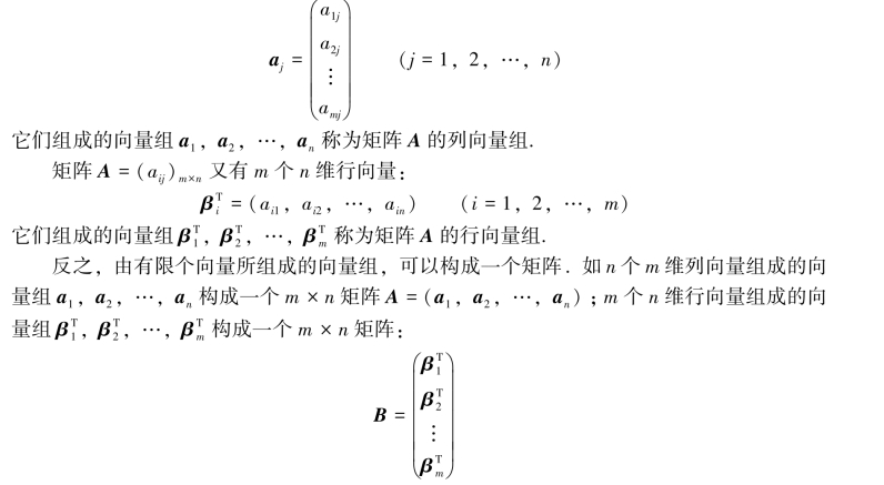 因此,含有有限个向量的有序向量组可以与矩阵一一对应.利用向量组与矩阵之间的这种关系,通过矩阵来研究向量组,也可以通过向量组来研究矩阵.