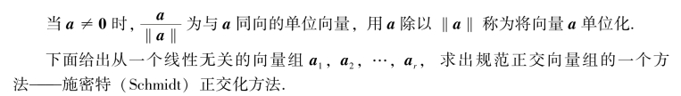 定理3.5.2(施密特正交化方法) 从线性无关的向量组a1,a2,…,ar出发,用构造性方法求出一个正交向量组b1,b2,…,br,再将b1,b2,…,br单位化,即可得到规范正交向量组η1,η2,…,ηr,此规范正交向量组η1,η2,…,ηr与a1,a2,…,ar等价.