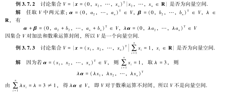 定义3.7.2 设V⊆Rn,V≠∅,若V对向量的加法及数乘运算封闭,则称V是向量空间.