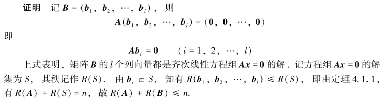例4.1.2 设Am×nBn×l=O,证明:R(A)+R(B)≤n.