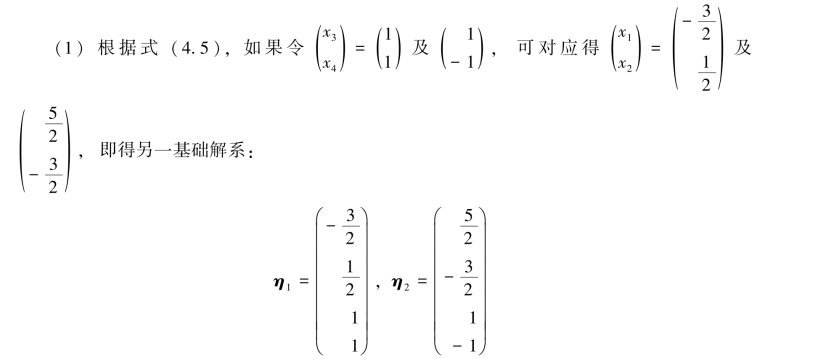 (3)上述解法中,由于为行最简形矩阵的结构,故x1总是选为非自由未知数.对于解方程来说,x1当然也可选为自由未知数.如果要选x1为自由未知数,那么就不能采用上述化系数矩阵为行最简形矩阵的“标准程序”,而要稍作变化,对系数矩阵A作初等行变换时,先把其中某一列(不一定是第一列)化为(1,0,0,0)T.如本例中的第四列数值较简,容易化出3个0: