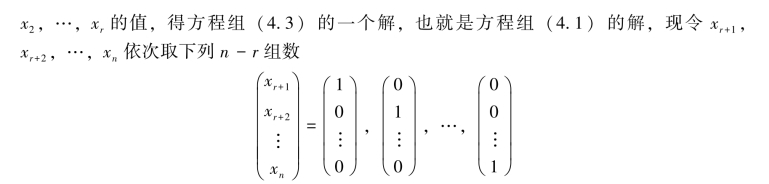 由于ξ1,ξ2,…,ξn-r是方程组(4.1)的解,故η也是方程组(4.1)的解.比较η和ξ知,它们的后n-r个分量对应相等,因为它们都满足方程组(4.3),从而它们的前r个分量亦对应相等,因此ξ=η.即