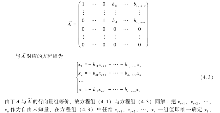 设系数矩阵A的秩为r,不妨设A的前r个列向量线性无关,于是A经过初等行变换化为行最简形矩阵:
