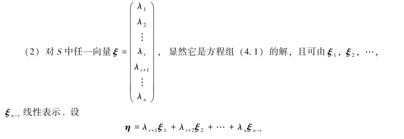 上述结论说明集合S对向量的加法和数乘两种运算是封闭的,所以集合S构成一个向量空间,称为齐次线性方程组(4.1)的解空间.