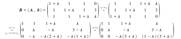 (1)当λ≠0且λ≠-3时,R(A)=R(B)=3,方程组有唯一解;
