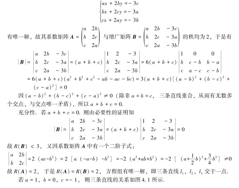 证明 三条平面直线交于一点的充分必要条件是由这三条直线的方程联立所得的二元线性方程组有唯一解,而它有唯一解的充分必要条件是系数矩阵的秩与增广矩阵的秩都等于2.