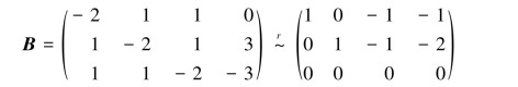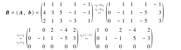 解法1 对增广矩阵B=(A,b)作初等行变换把它变为行阶梯形矩阵,有