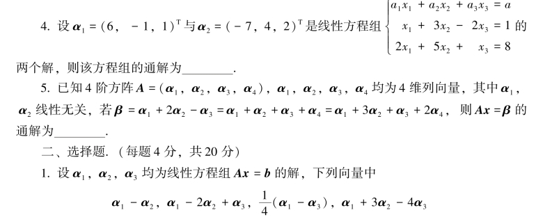 七、(5分)设三元非齐次线性方程组的系数矩阵A的秩为1,已知η1,η2,η3是它的三个解向量,且η1+η2=(1,2,3)T,η2+η3=(2,-1,1)T,η3+η1=(0,2,0)T,求该非齐次方程组的通解.