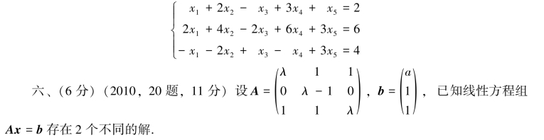 五、(5分)求非齐次线性方程组的一个解及对应的齐次线性方程组的基础解系: