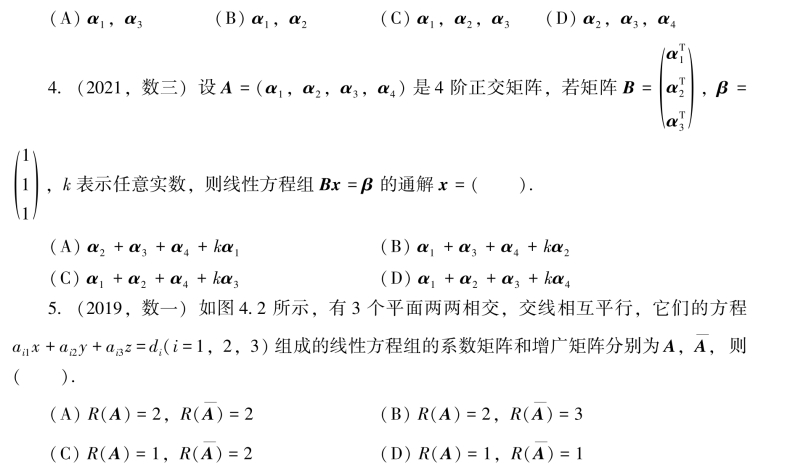 3.(2011,数一)设A=(α1,α2,α3,α4)是4阶矩阵,A*为A的伴随矩阵,若(1,0,1,0)T是方程组Ax=0的一个基础解系,则A*x=0基础解系可为( ).