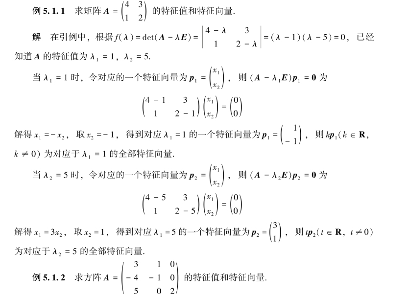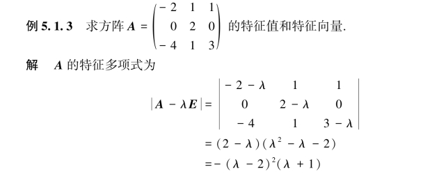 这两个例题都是特征方程有重根的情形.但是,例5.1.2的特征重根对应一个线性无关的特征向量,也就是A只有两个线性无关的特征向量;例5.1.3的特征重根对应两个线性无关的特征向量,也就是A有三个线性无关的特征向量,这个结论在矩阵对角化时十分重要.