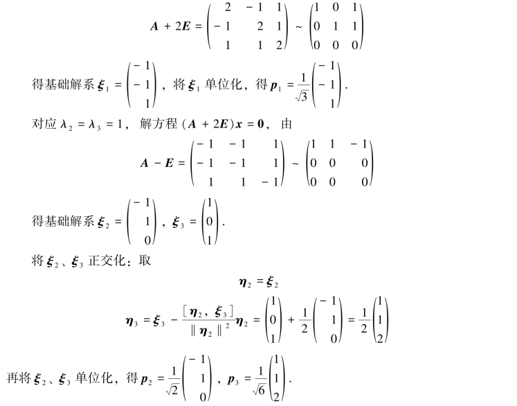 (2)对求得的每个ki重特征值λi,求齐次线性方程组(A-λiE)x=0的基础解系,得到ki个线性无关的特征向量,再把它们正交化、单位化,得到ki个两两正交的单位特征向量.因为k1+k2+…+ks=n,所以总共可得n个两两正交的单位化的特征向量.