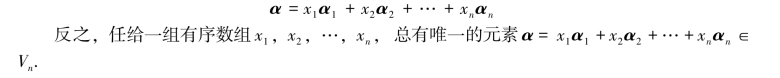 设α1,α2,…,αn是Vn的一个基,对于∀α∈Vn,存在唯一的一组有序数组x1,x2,…,xn,使得