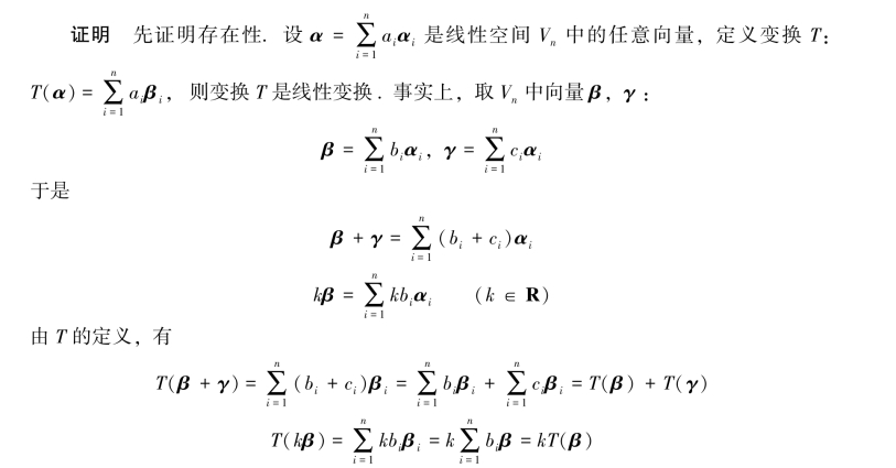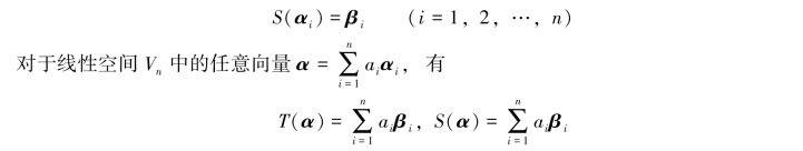 定理6.3.2 设α1,α2,…,αn是线性空间Vn的一个基,β1,β2,…,βn是Vn中任意n个向量,则存在唯一的线性变换T,使得