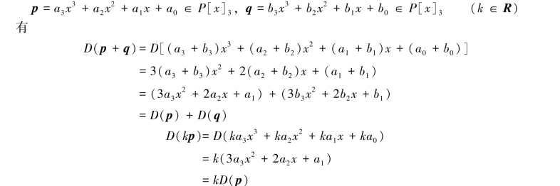 (2)显然T是P[x]3的一个变换,因为T(p+q)=a0+b0=T(p)+T(q);T(kp)=ka0=kT(p),故T是P[x]3中的线性变换.