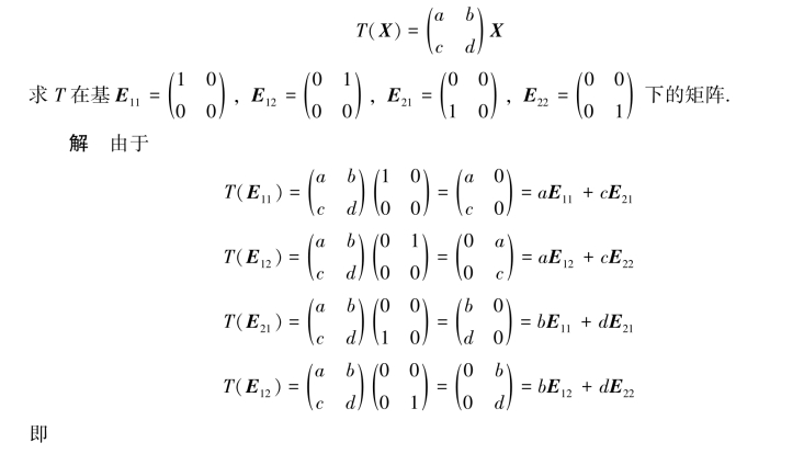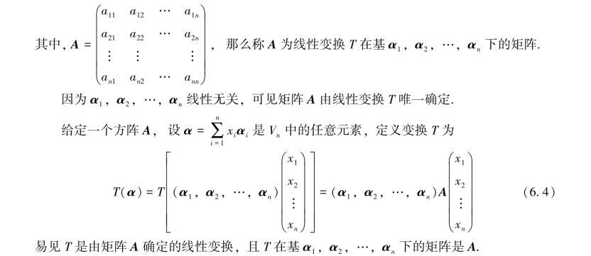 这样,在Vn中取定一个基后,由线性变换T可以唯一地确定一个矩阵A,由一个矩阵A也可唯一地确定一个线性变换T.故在给定基的条件下,线性变换与矩阵有一一对应的关系.