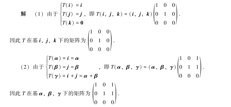 (2)取基为α=i,β=j,γ=i+j+k,求T在该基下的矩阵.