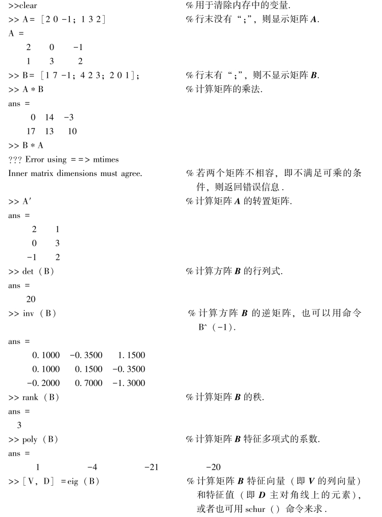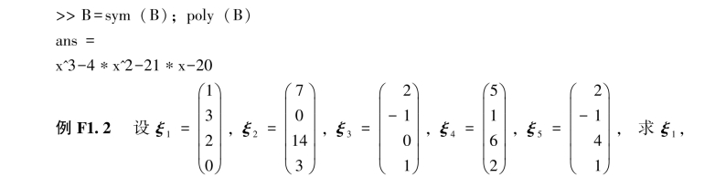 (3)poly(B)命令计算的是矩阵B的特征多项式的系数,由MATLAB运算结果可知B的特征多项式为:x3-4x2-21x-20.此外,运用符号运算工具箱中的poly()函数同样可以求出矩阵的特征多项式,如