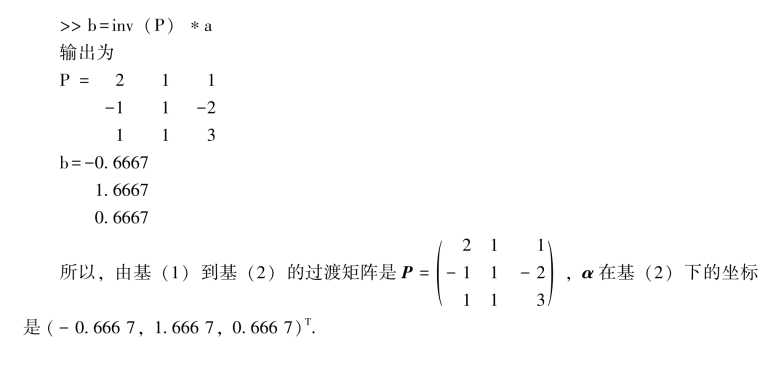用MATLAB求由基(1)到基(2)的过渡矩阵,设α在基(1)下的坐标为(1,1,3)T,求α在基(2)下的坐标.