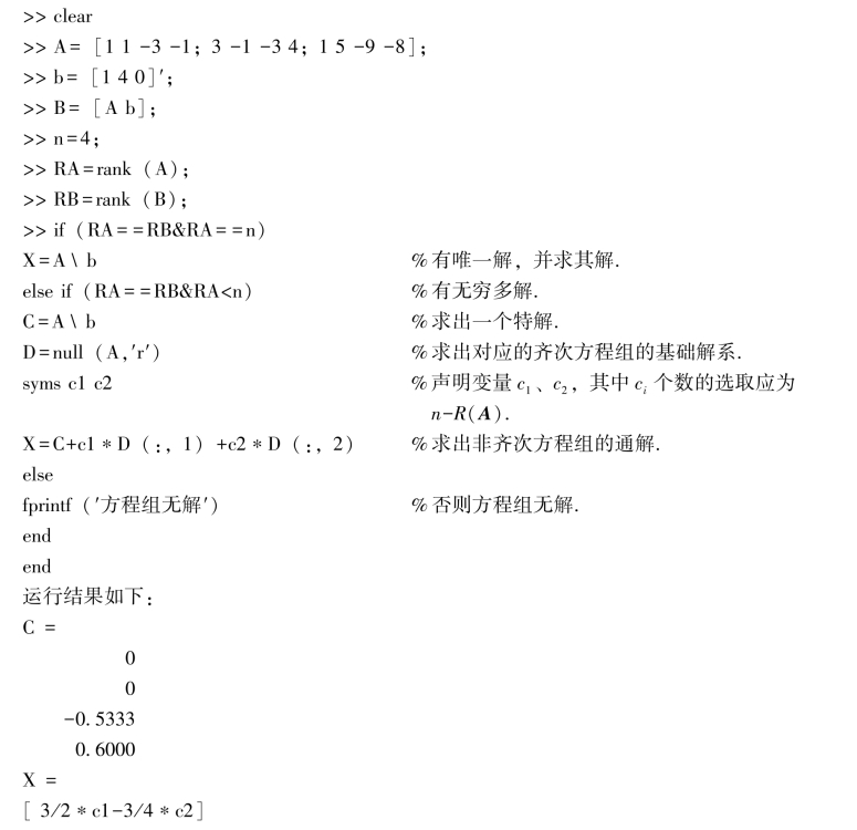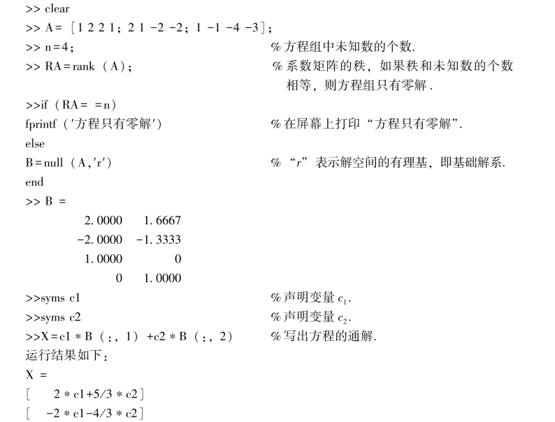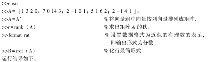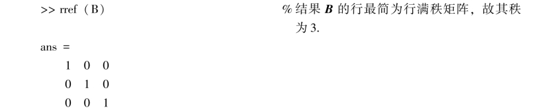 (2)在求矩阵B的秩时,也可以将B化为行最简行矩阵,然后观察其非零行的个数,从而确定R(B),命令如下: