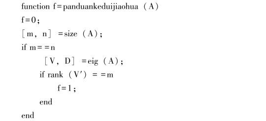 解 方阵A可以对角化的充分必要条件是它的几何重数等于代数重数,即满足A的特征值λ的几何重数为方程组(A-λE)x=0的解空间的维数.按照此思想,编写函数panduankeduijiaohua.m文件如下: