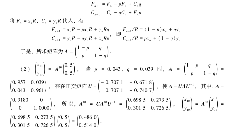解 设该国家的总人口数量是定值R,第n年农村人口和城镇人口分别为Fn,Cn.