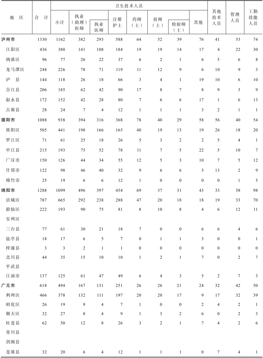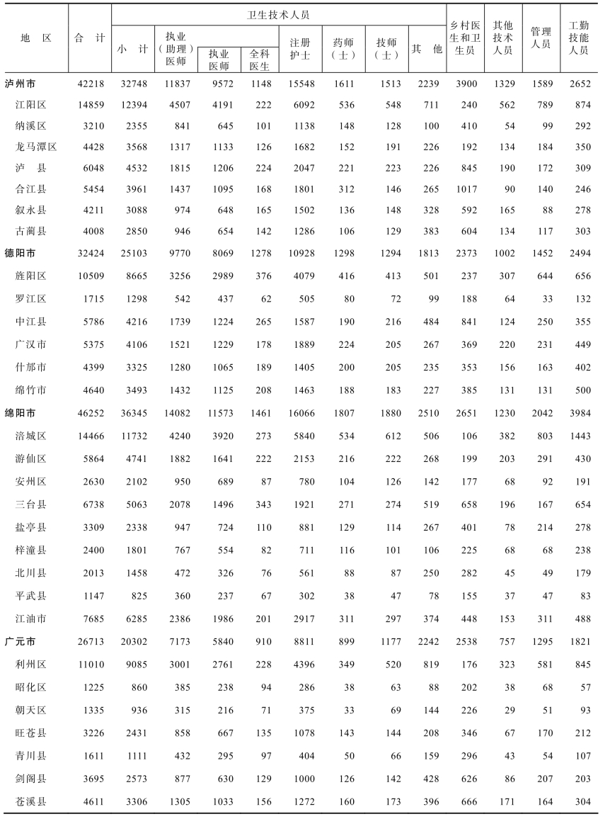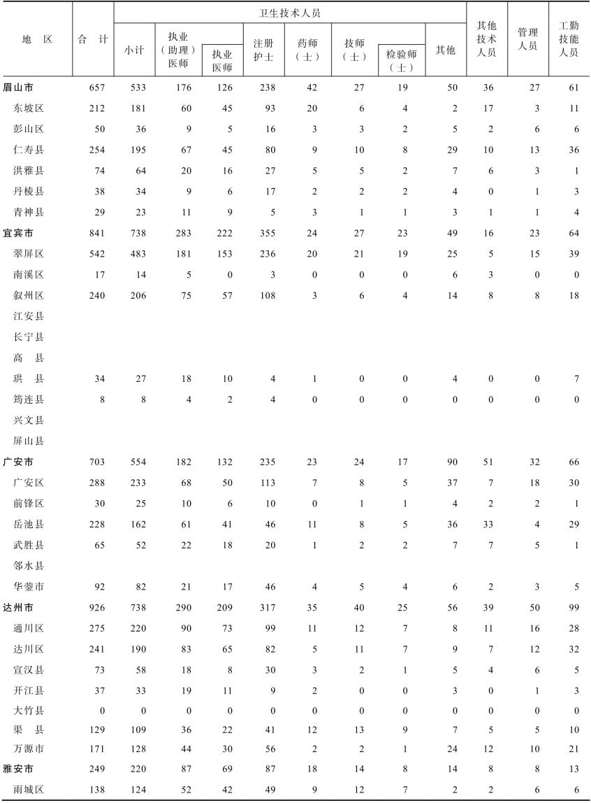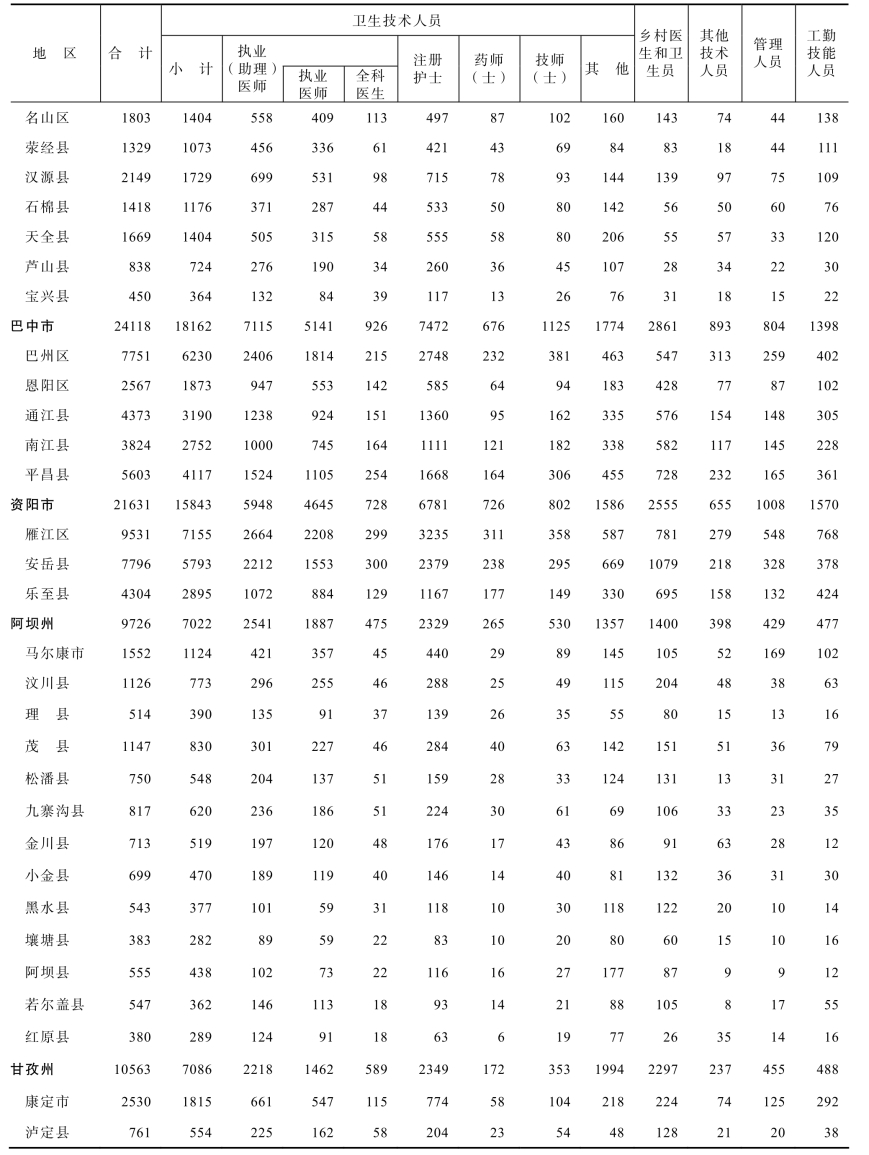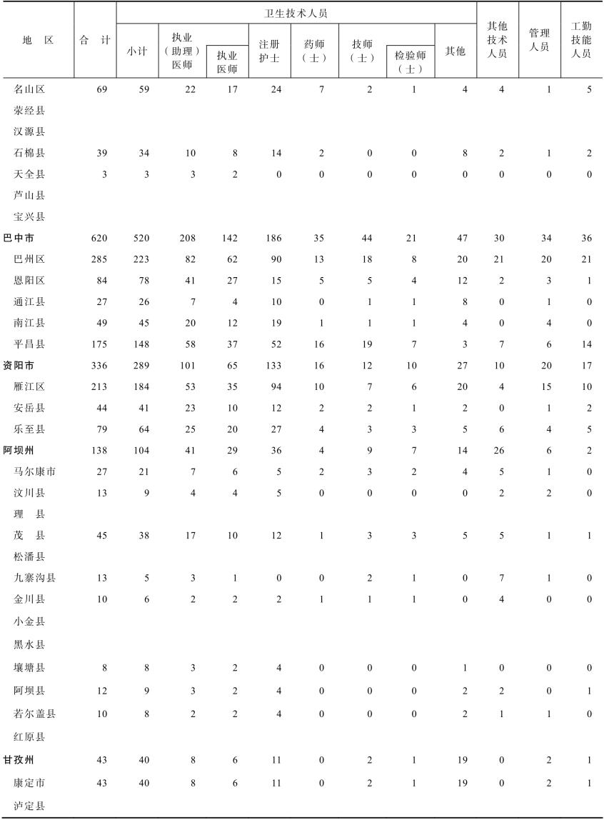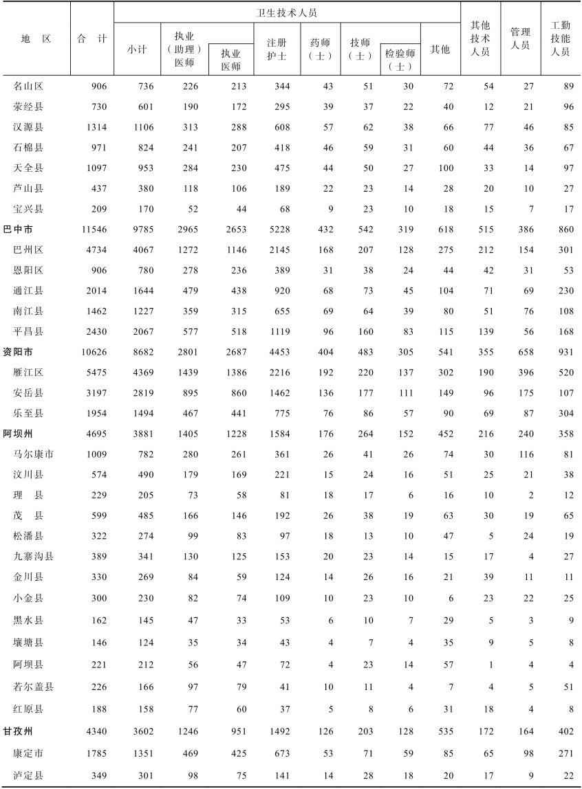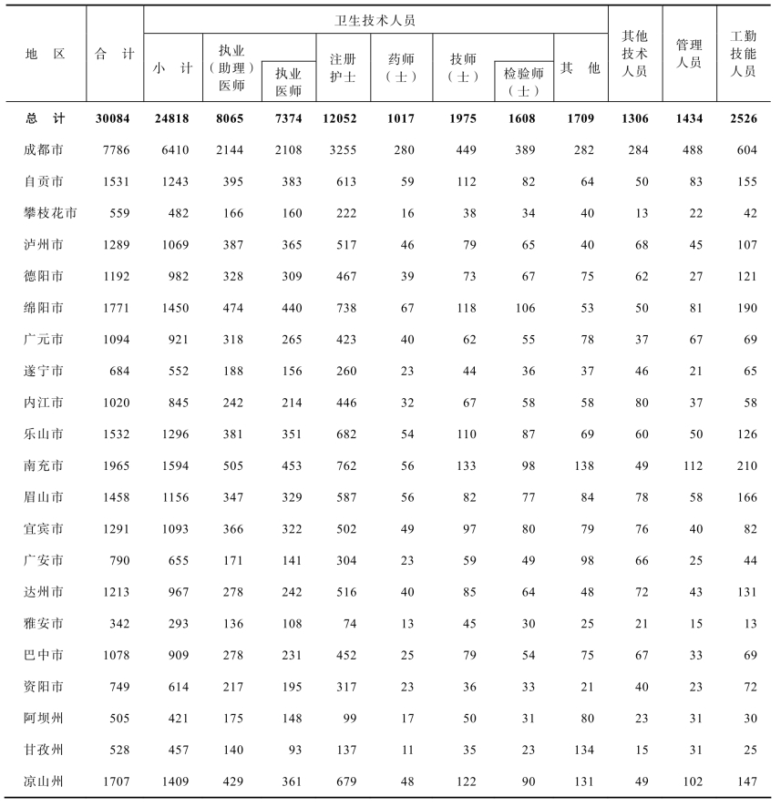 注:① 本表统计数据不包括门诊部、诊所、村卫生室数据;② 本表统计数据来源于四川省卫生健康人力资源管理系统,因填报原因,数据与表2-1-2略有差异,仅供参考。