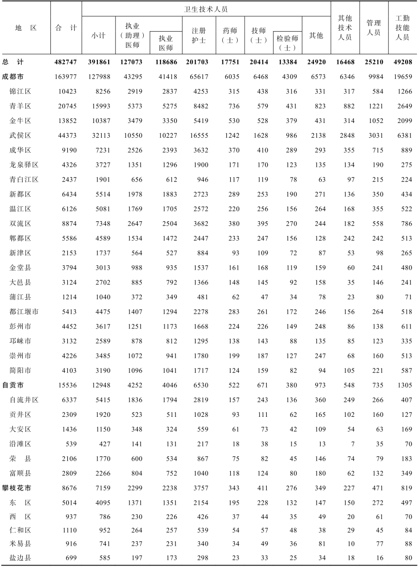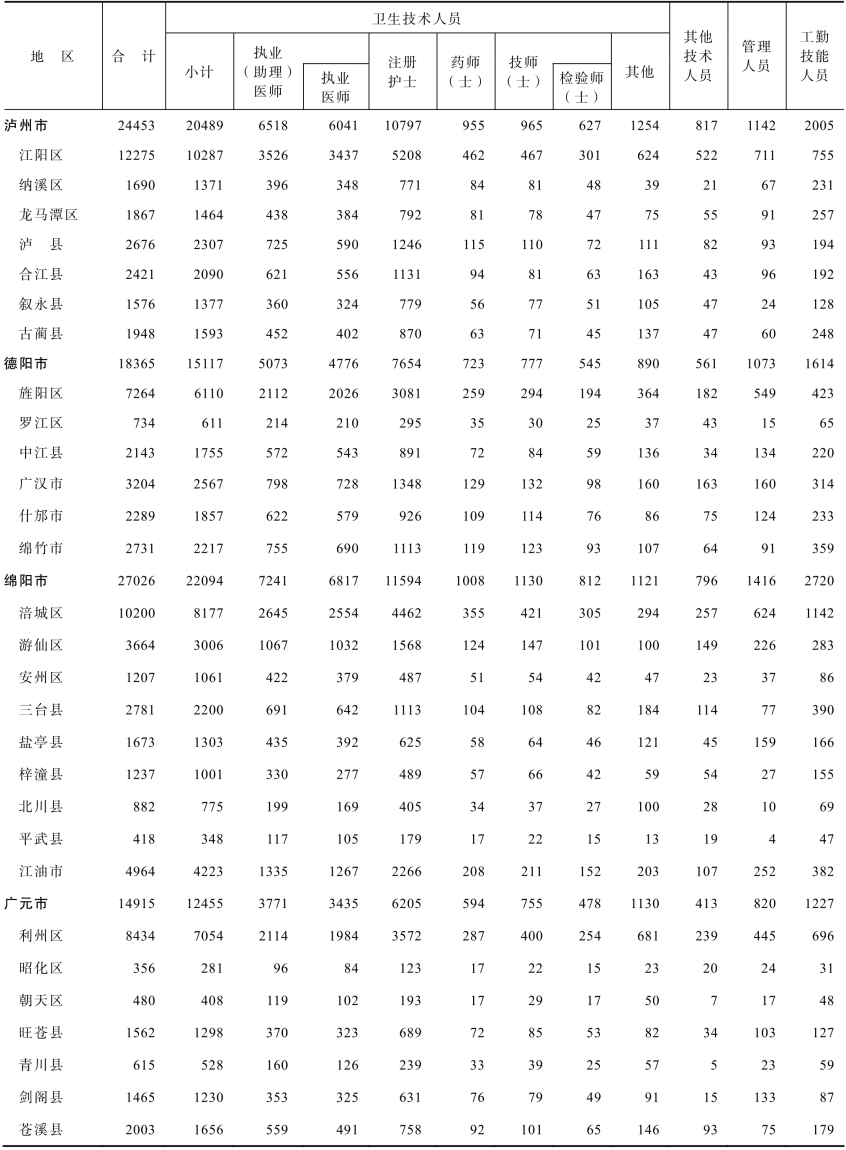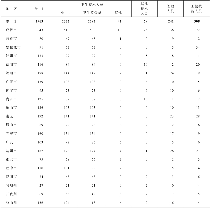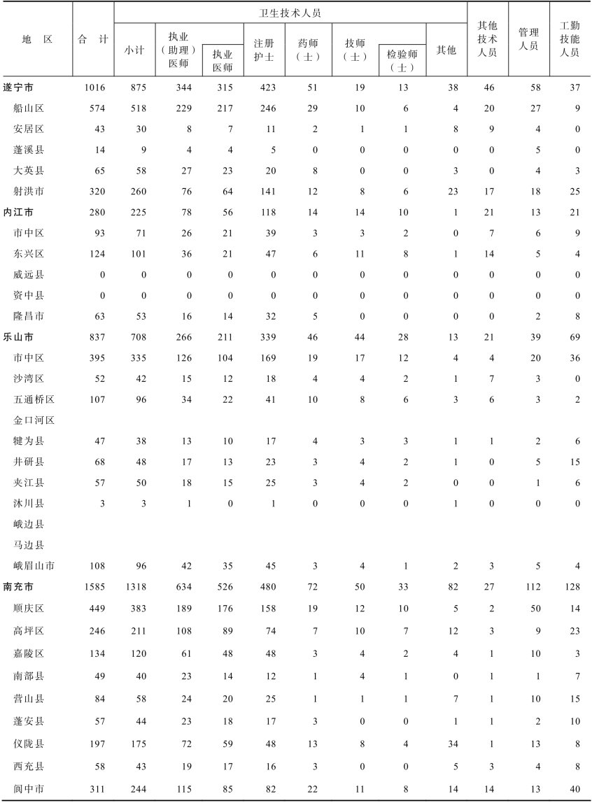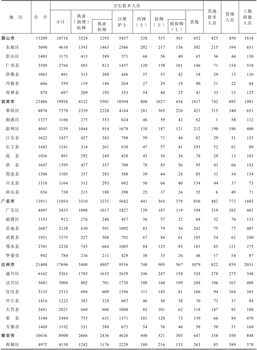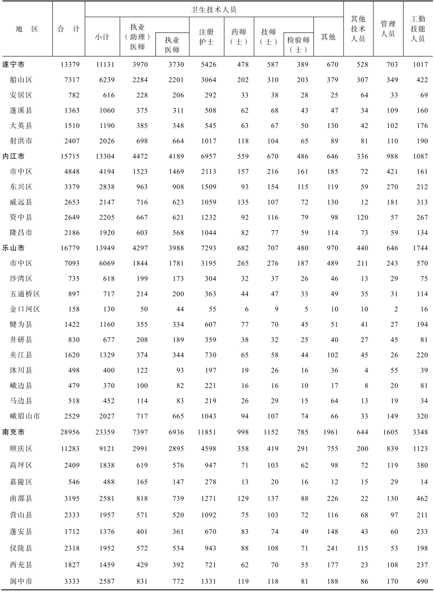 注:① 本表统计数据不包括门诊部、诊所、村卫生室数据;② 本表统计数据来源于四川省卫生健康人力资源管理系统,因填报原因,数据与表2-1-2略有差异,仅供参考。