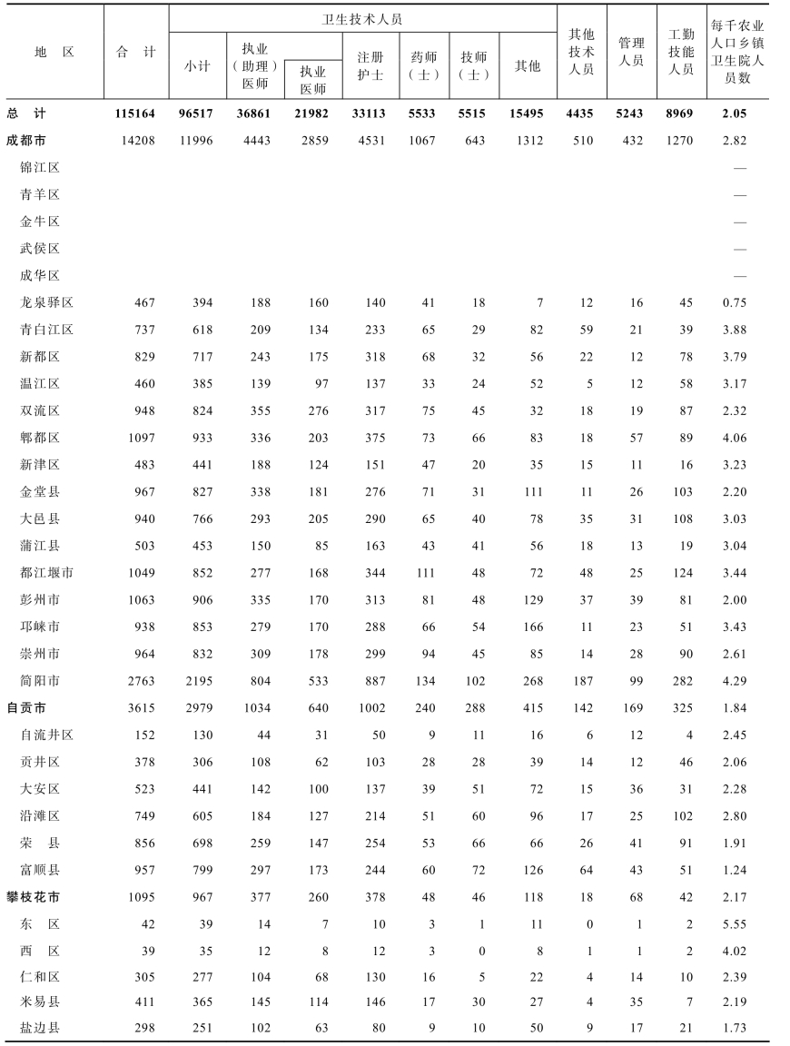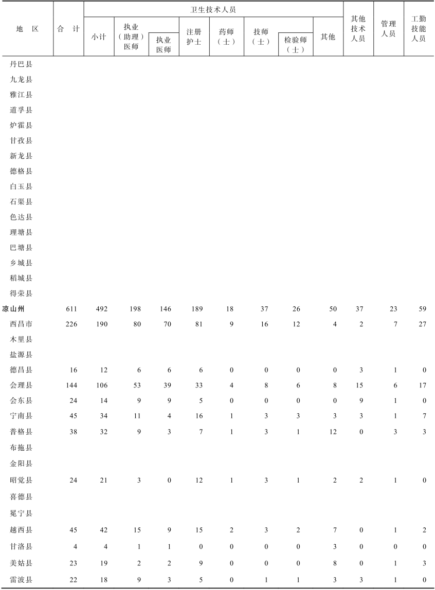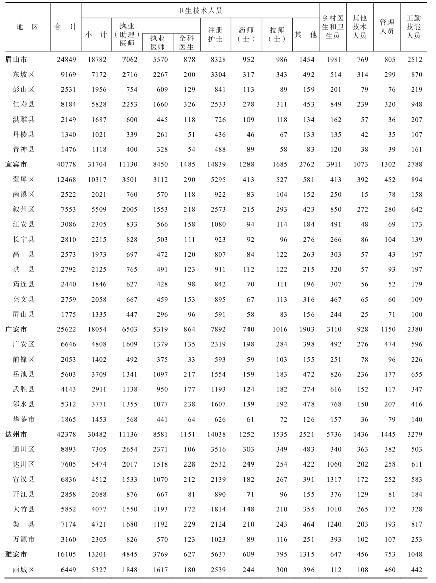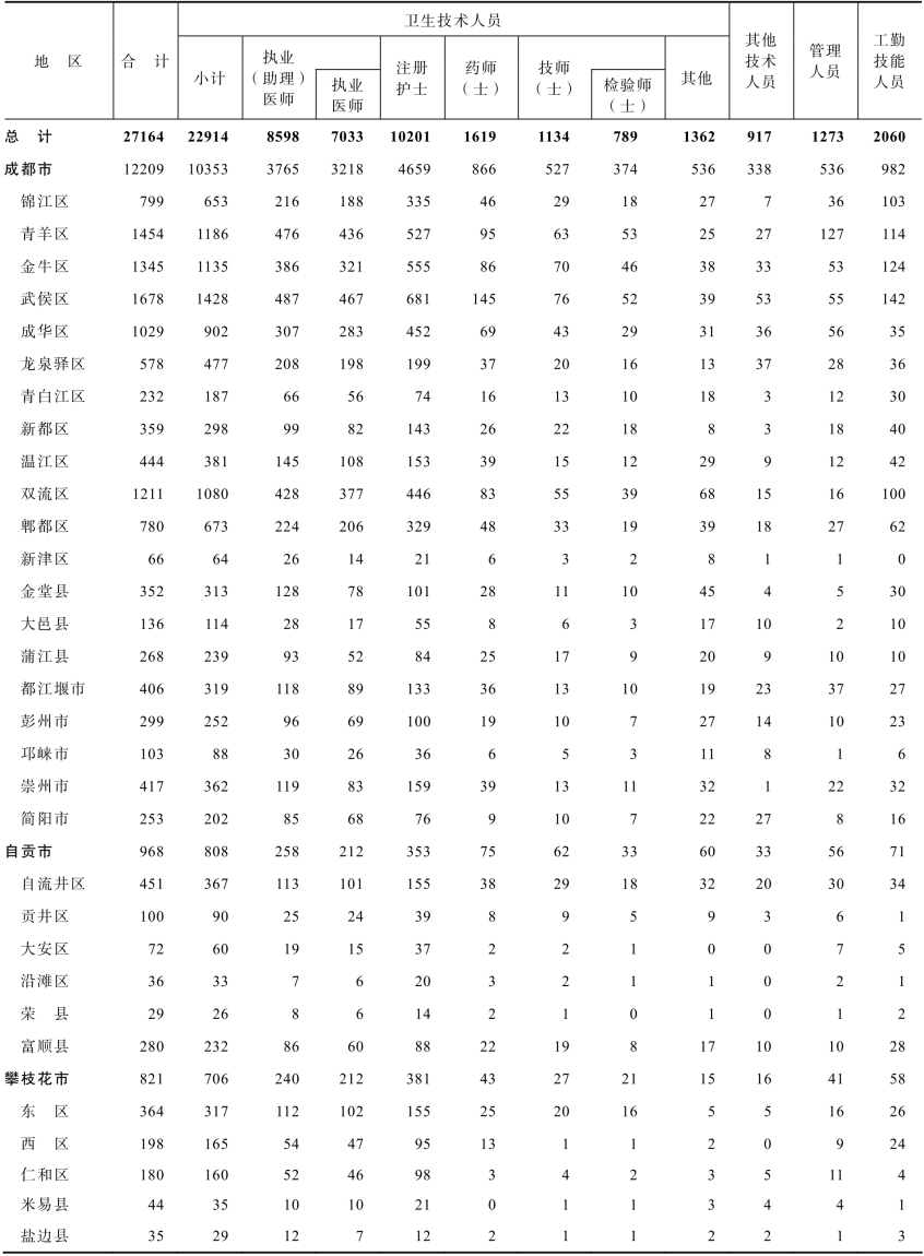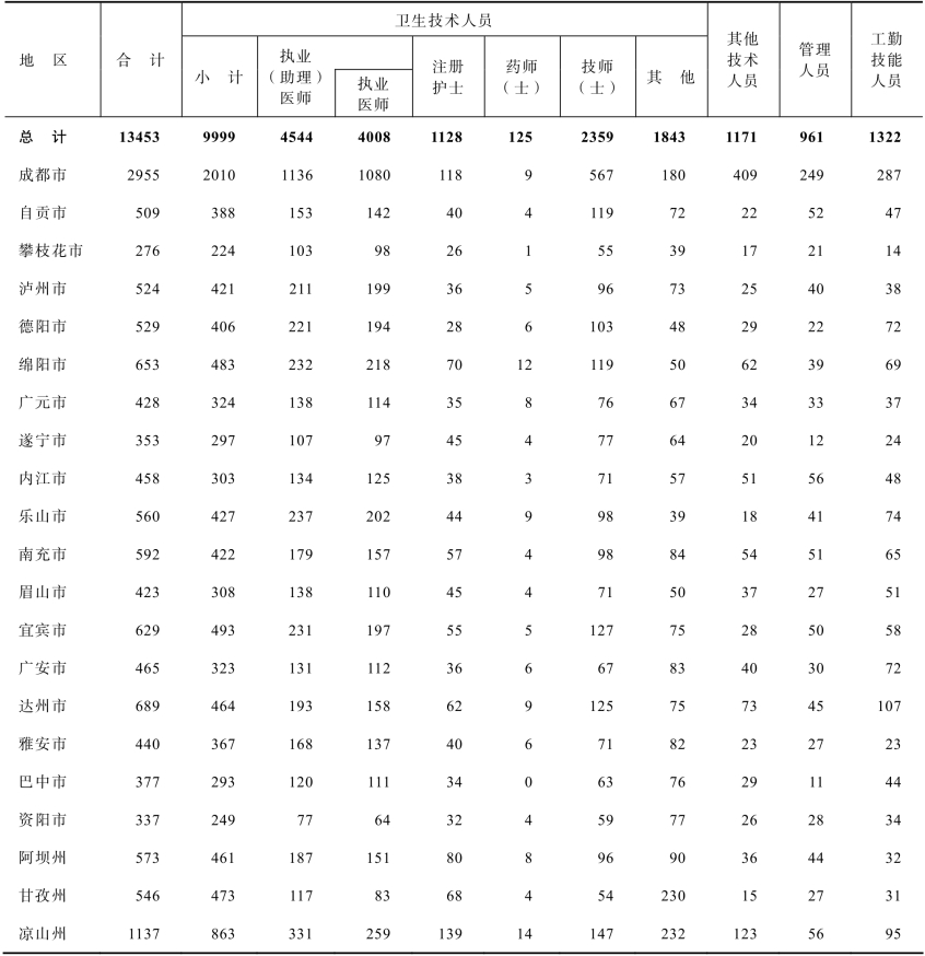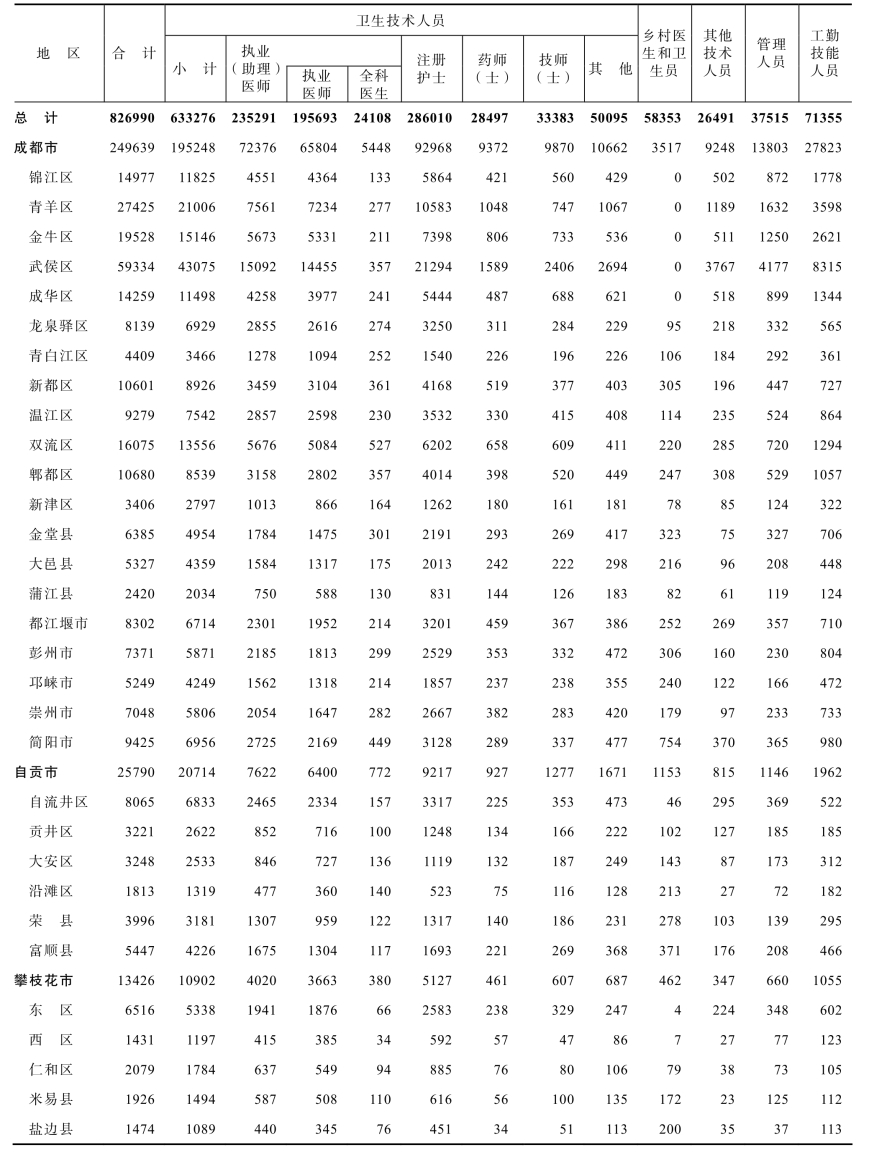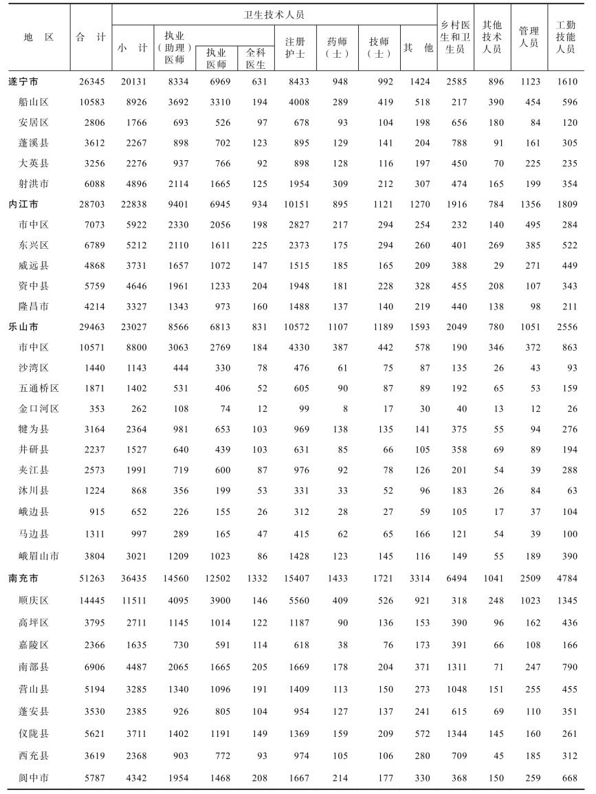 注:① 本表统计数据不包括门诊部、诊所、村卫生室数据;② 本表统计数据来源于四川省卫生健康人力资源管理系统,因填报原因,数据与表2-1-2略有差异,仅供参考。