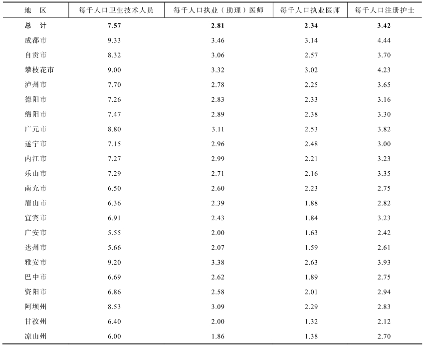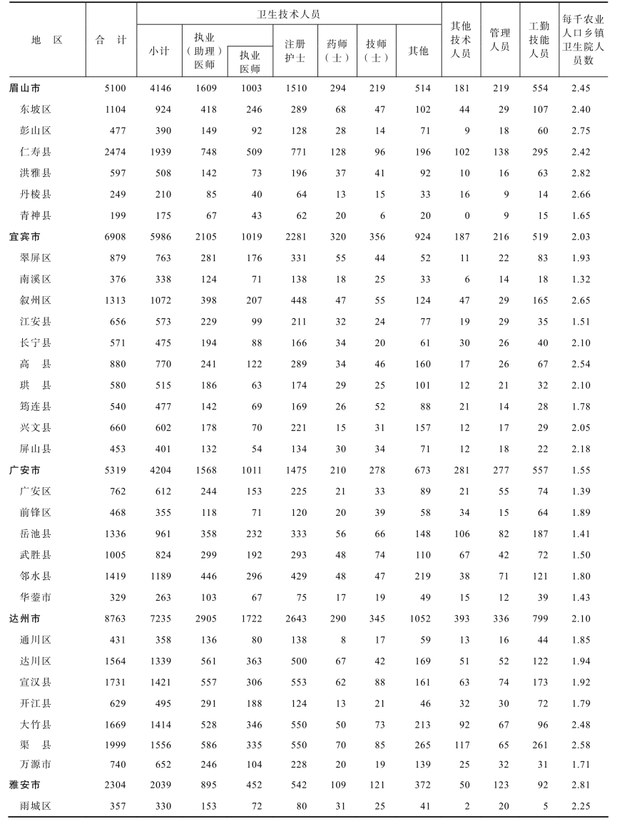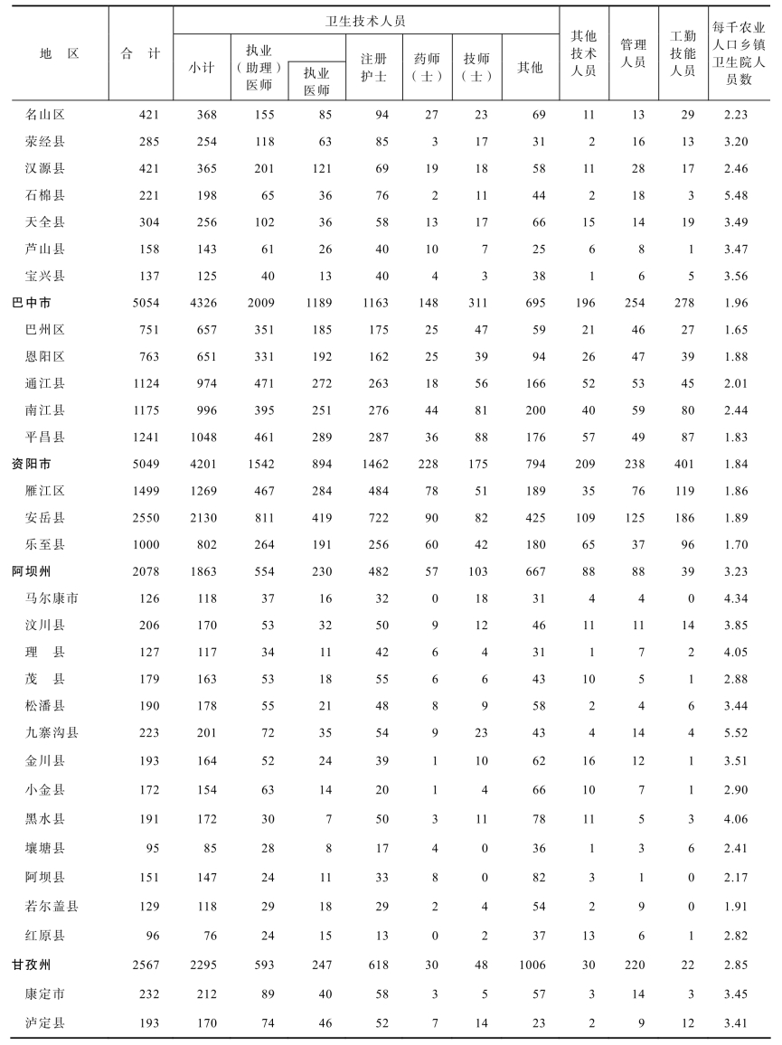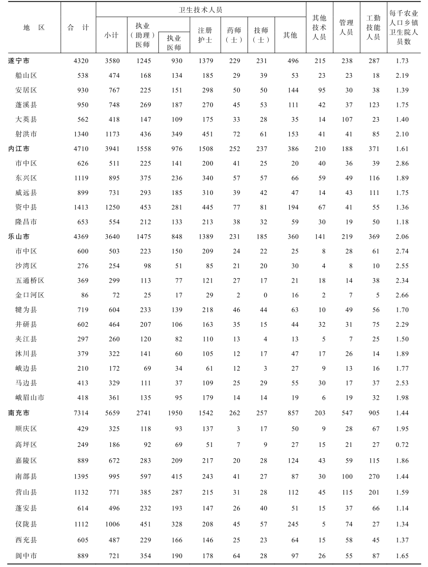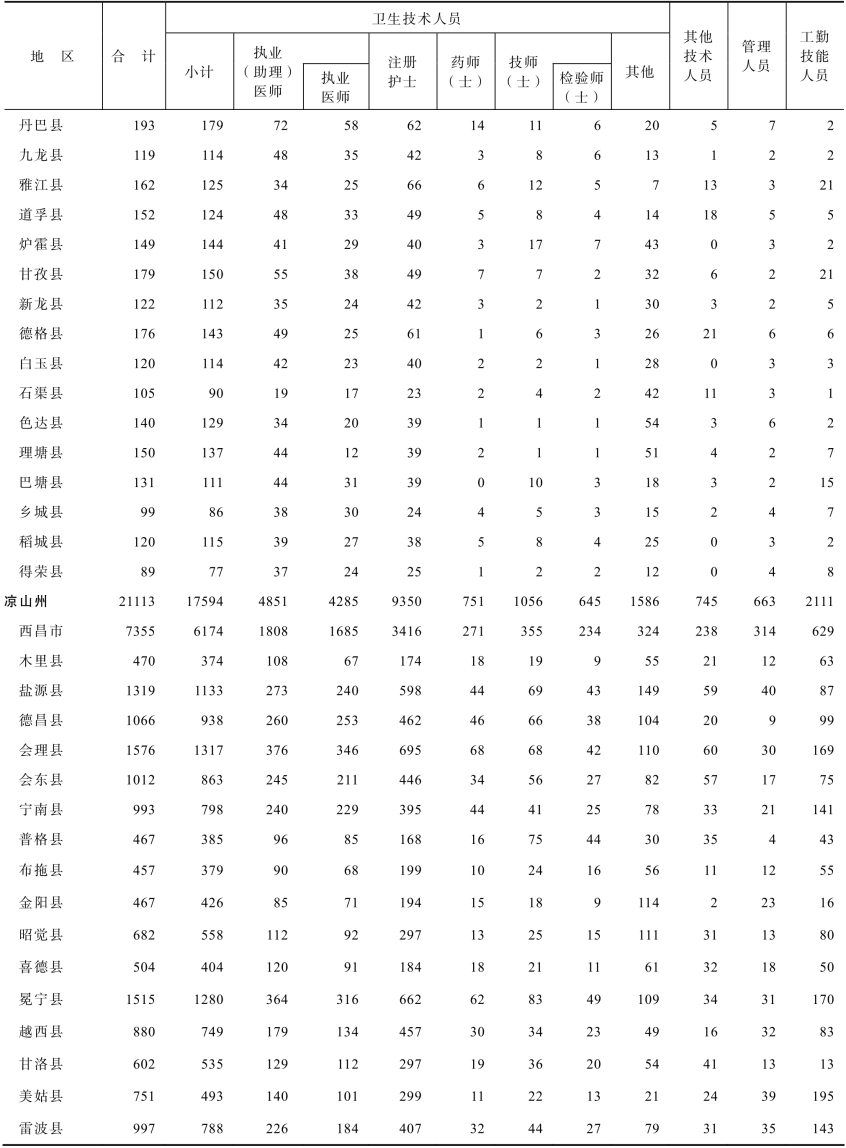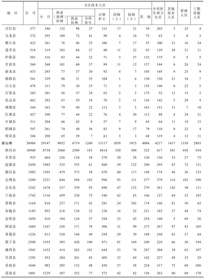 注:① 本表统计数据不包括门诊部、诊所、村卫生室数据;② 本表统计数据来源于四川省卫生健康人力资源管理系统,因填报原因,数据与表2-1-2略有差异,仅供参考。