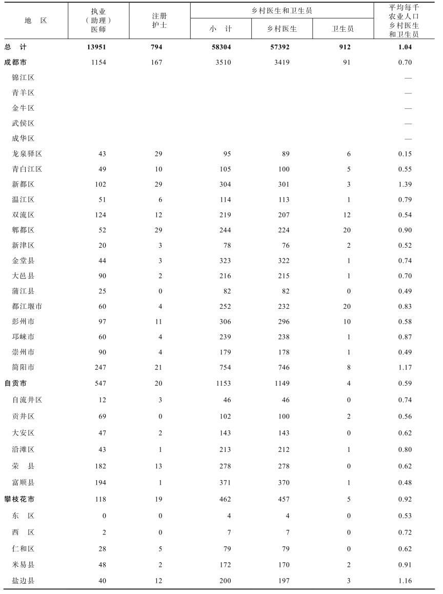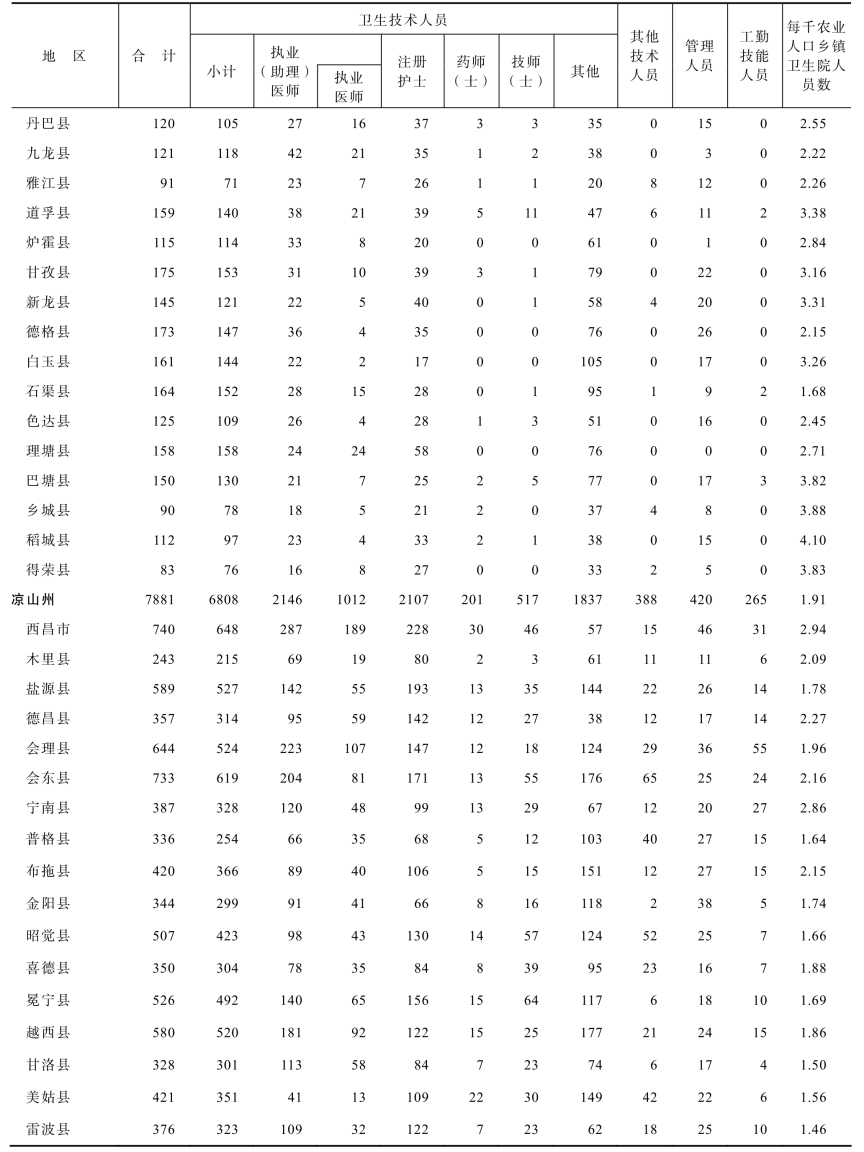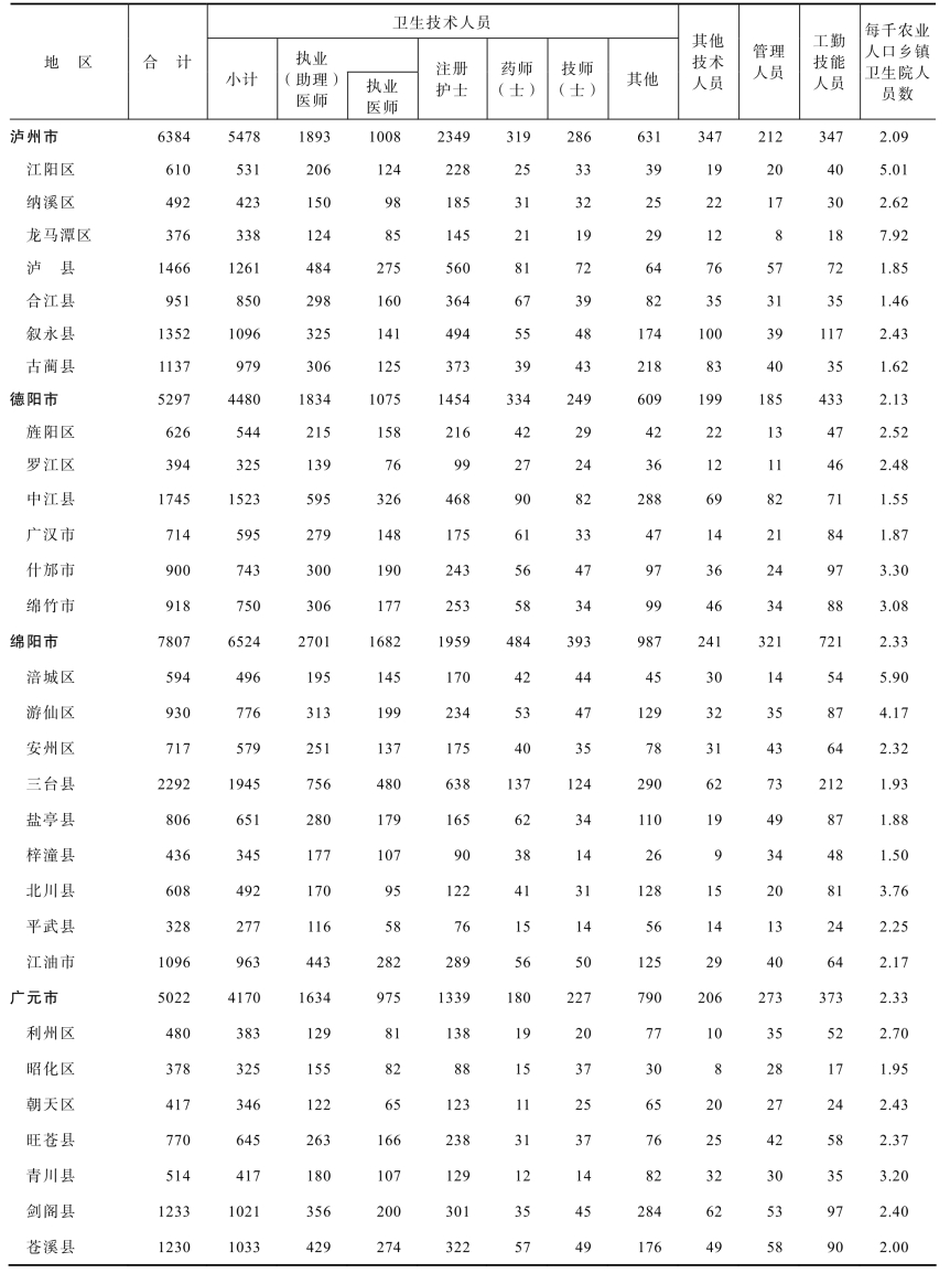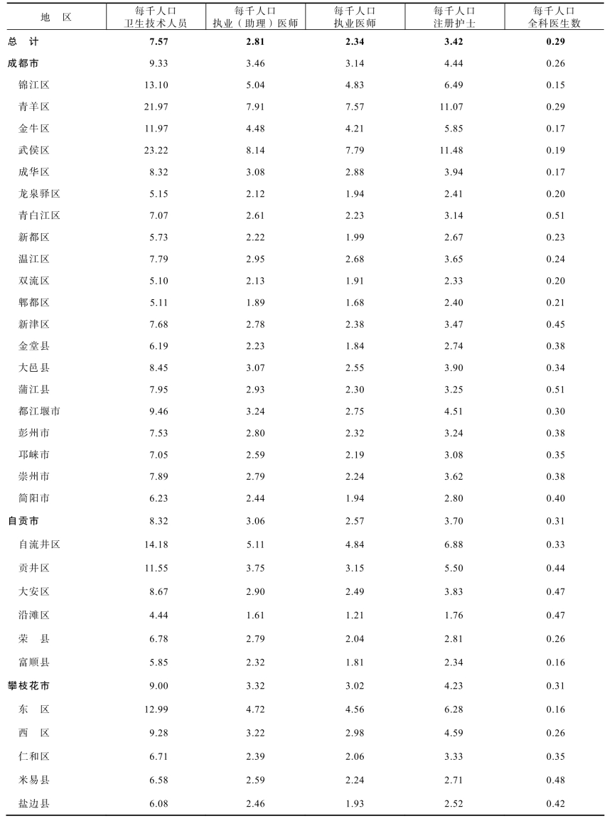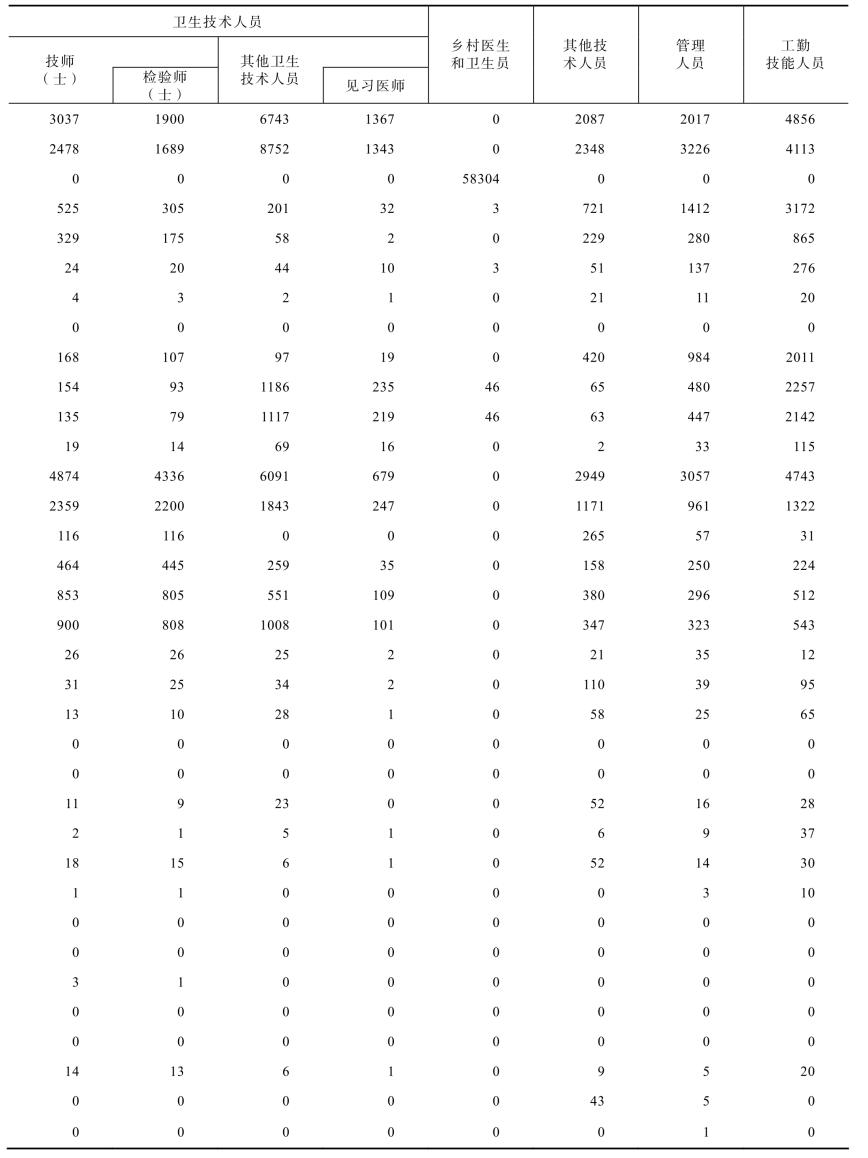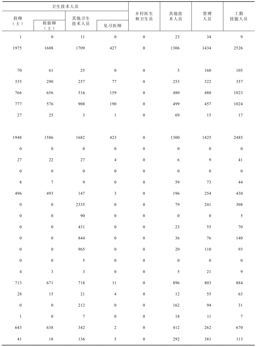 注:① 本表统计数据不包括门诊部、诊所、村卫生室数据;② 本表统计数据来源于四川省卫生健康人力资源管理系统,因填报原因,数据与表2-1-2略有差异,仅供参考。
