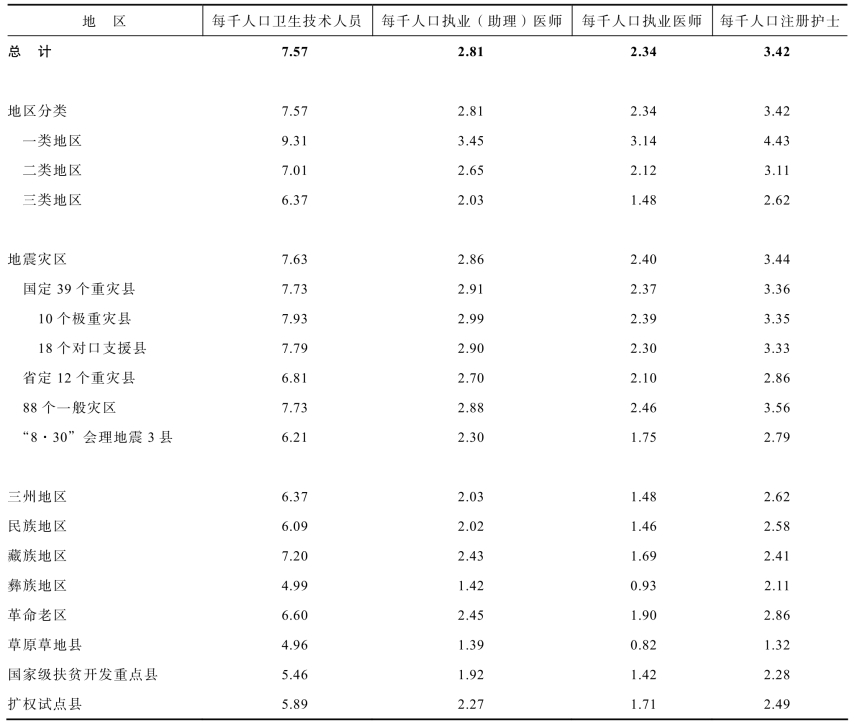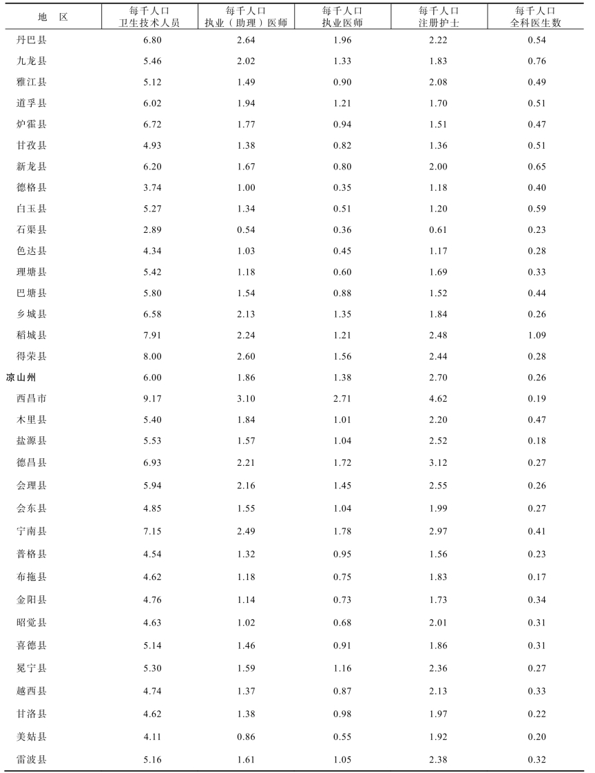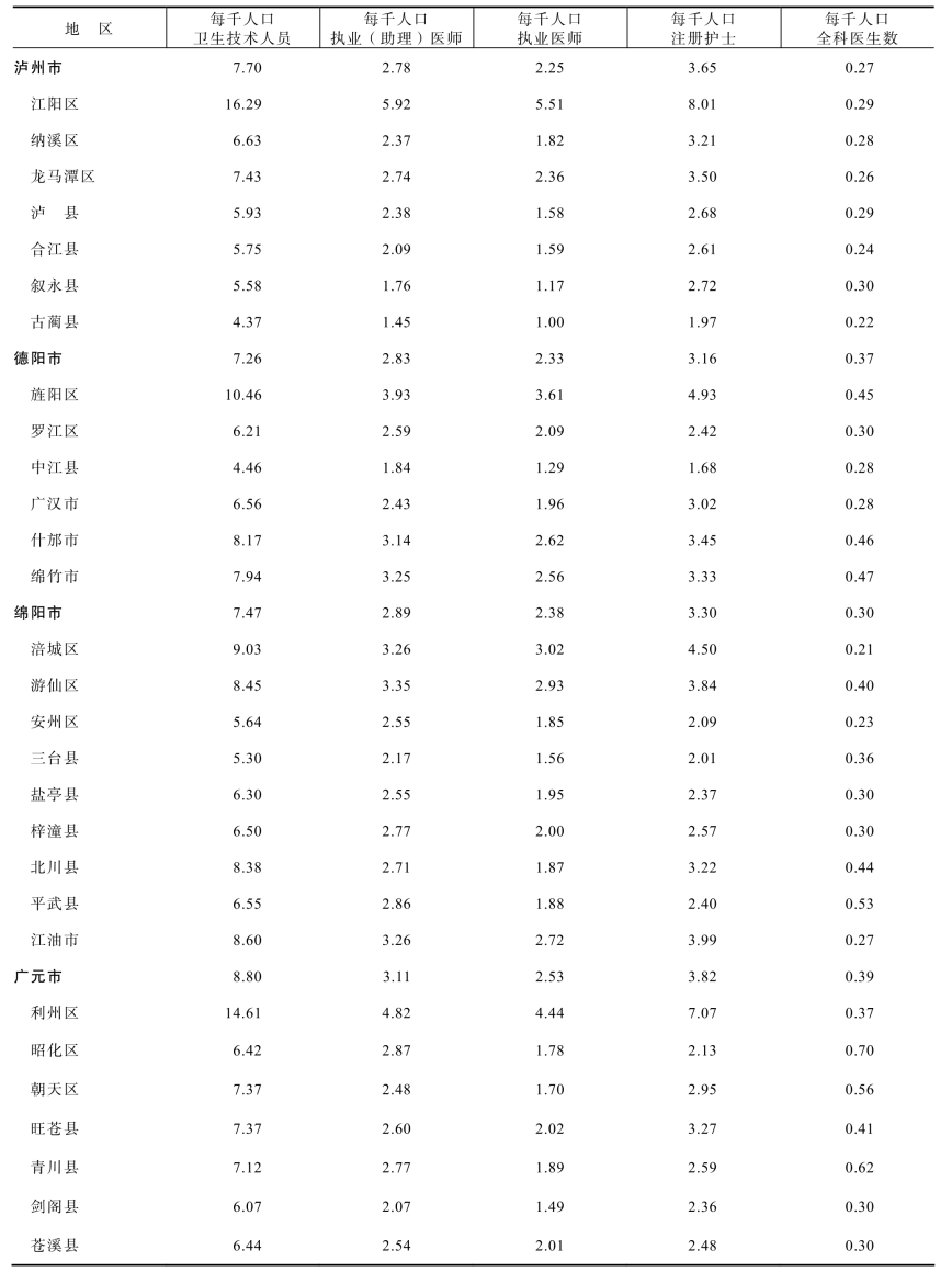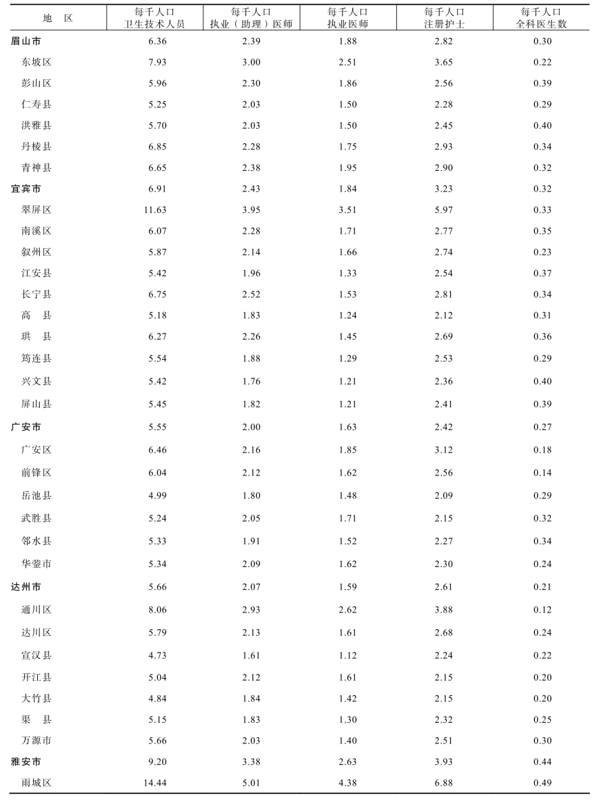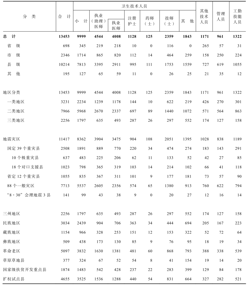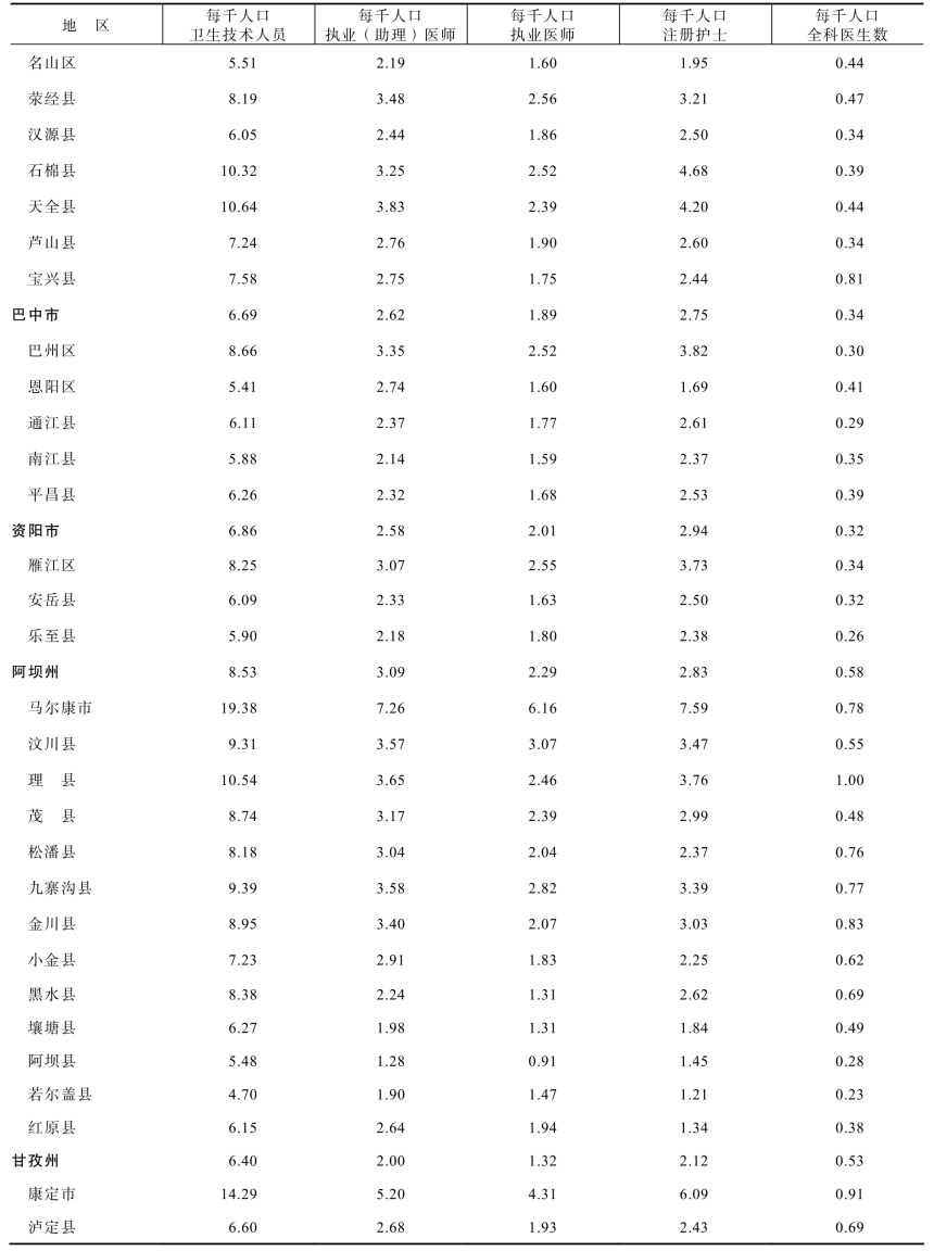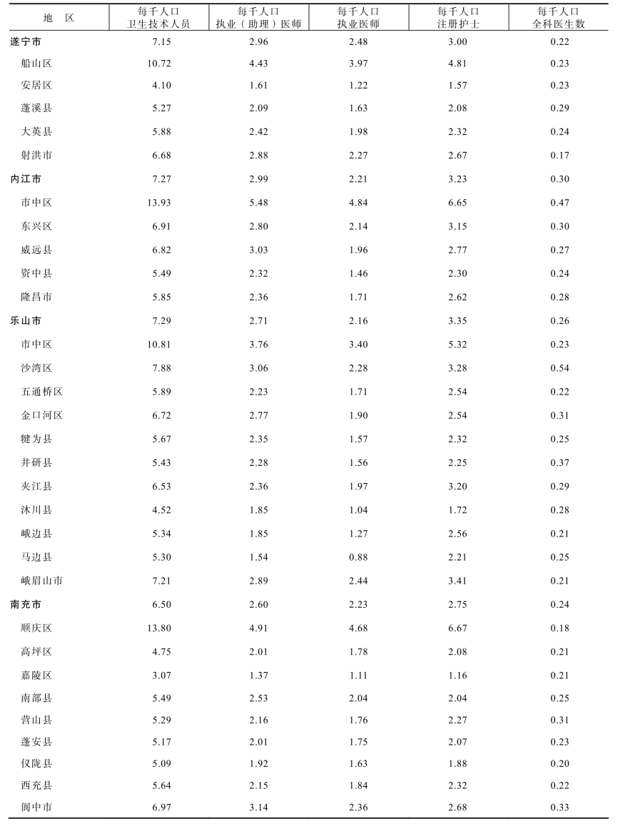 注:① 本表统计数据不包括门诊部、诊所、村卫生室数据;② 本表统计数据来源于四川省卫生健康人力资源管理系统,因填报原因,数据与表2-1-2略有差异,仅供参考。