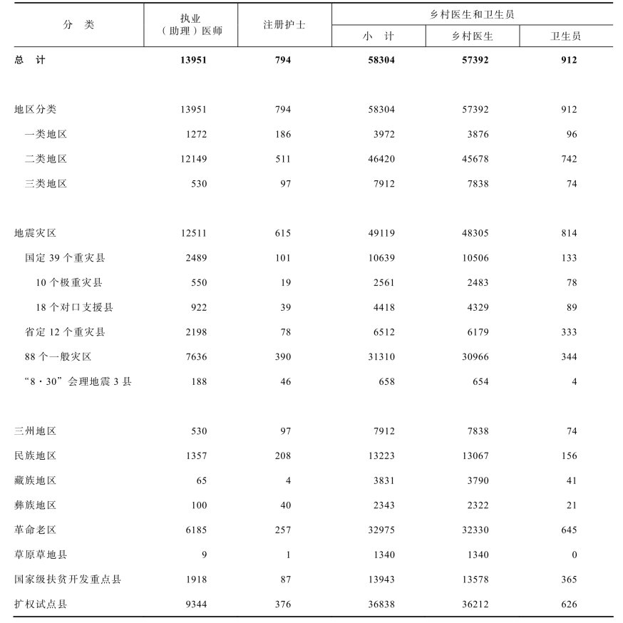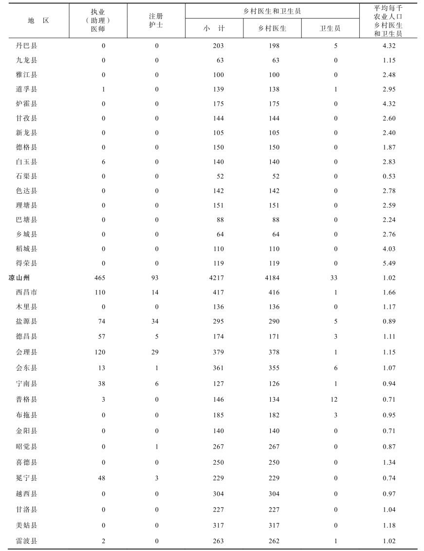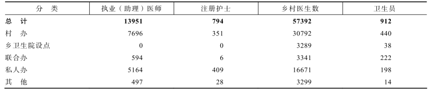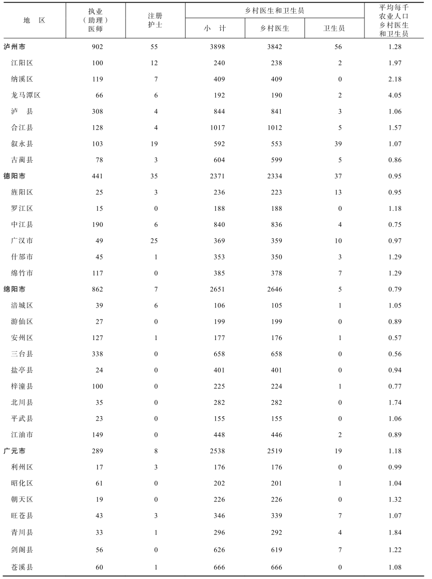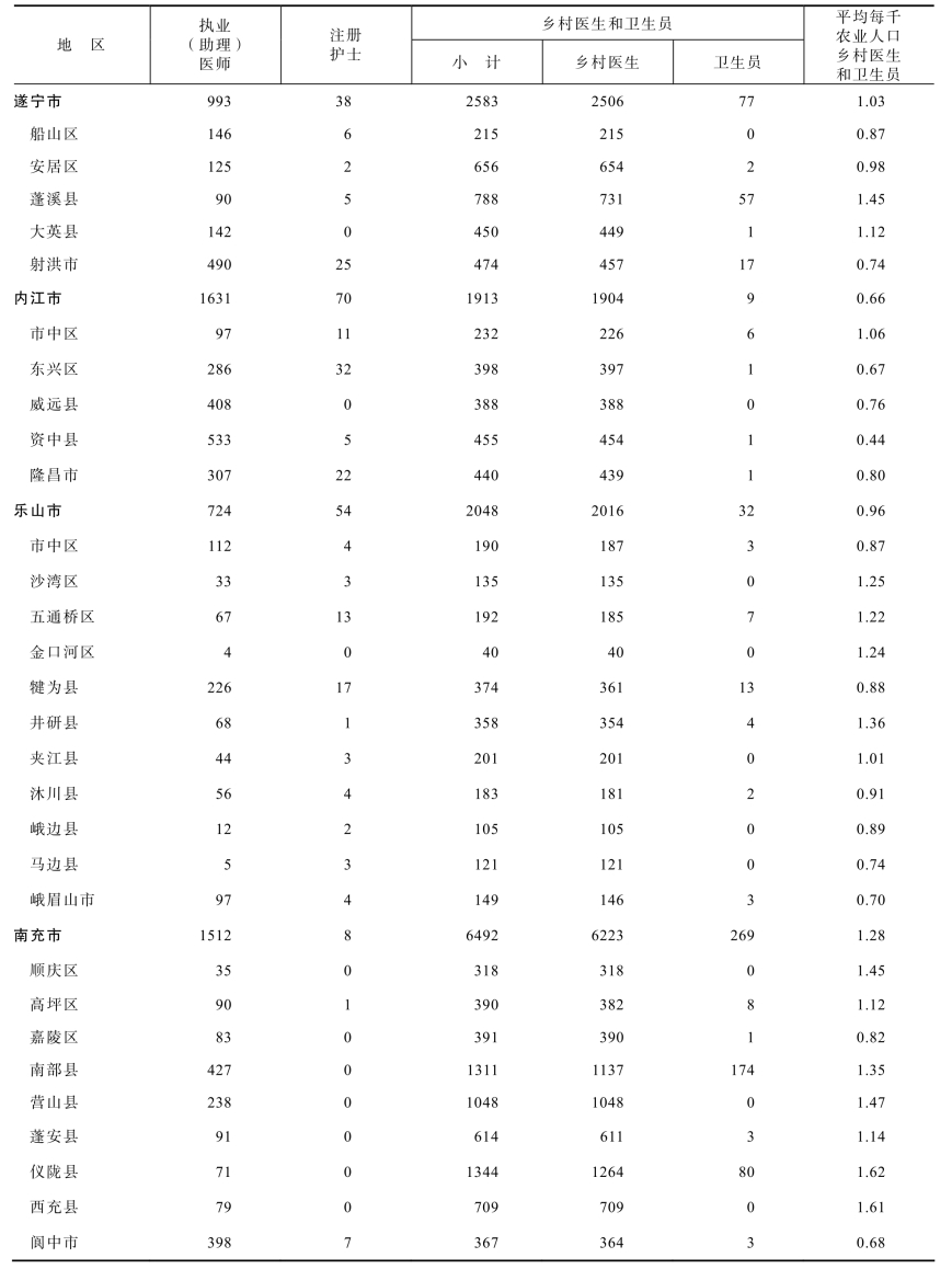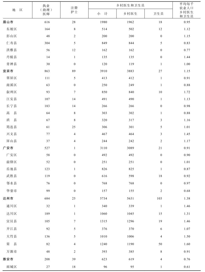 注:本表包括乡镇卫生院在村卫生室工作的执业(助理)医师和注册护士数。