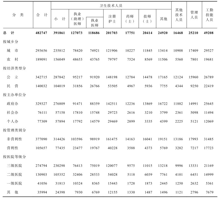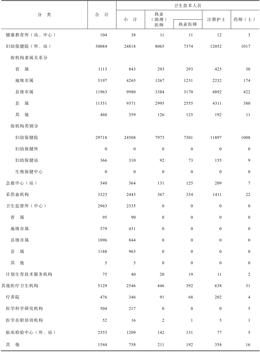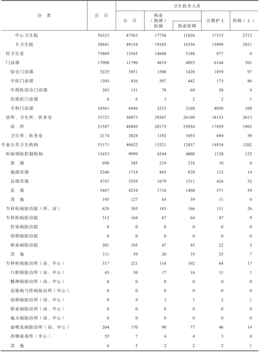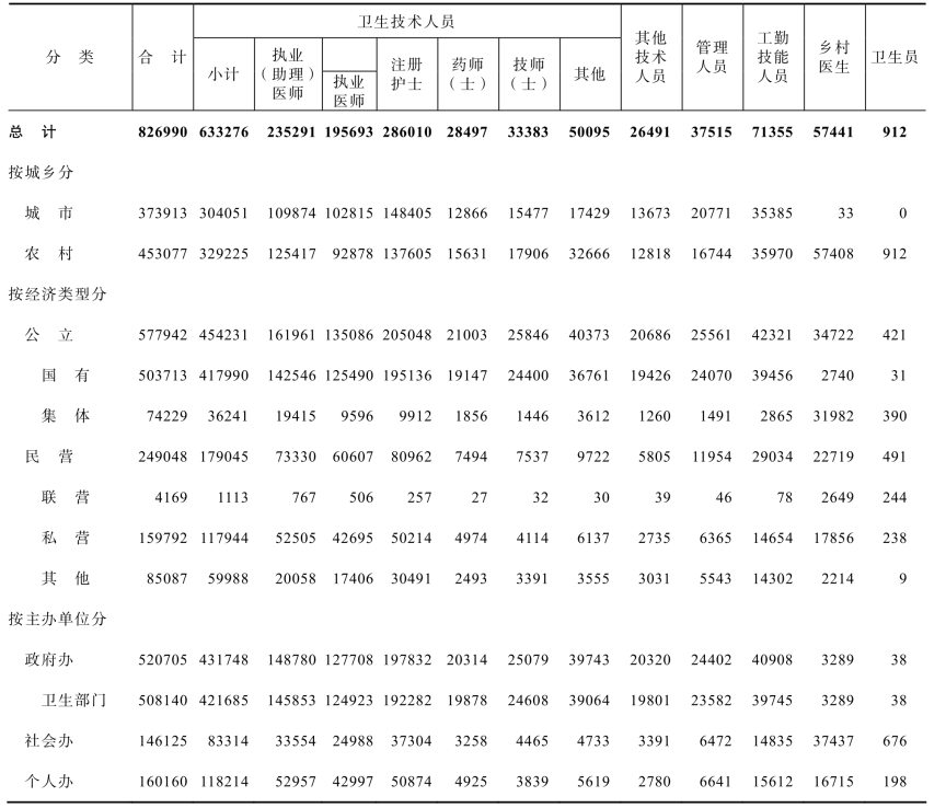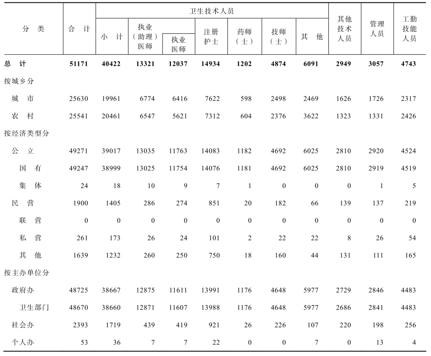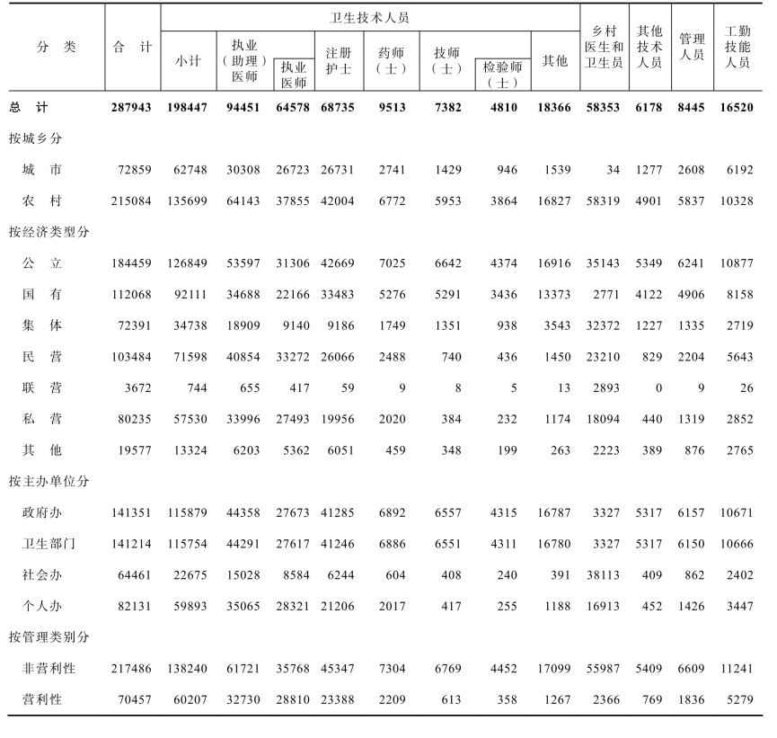 注:本表按城乡及按经济类型分卫生技术人员总数中不包括乡镇卫生院在村卫生室工作的人员数(这部分人员计入乡镇卫生院中)。