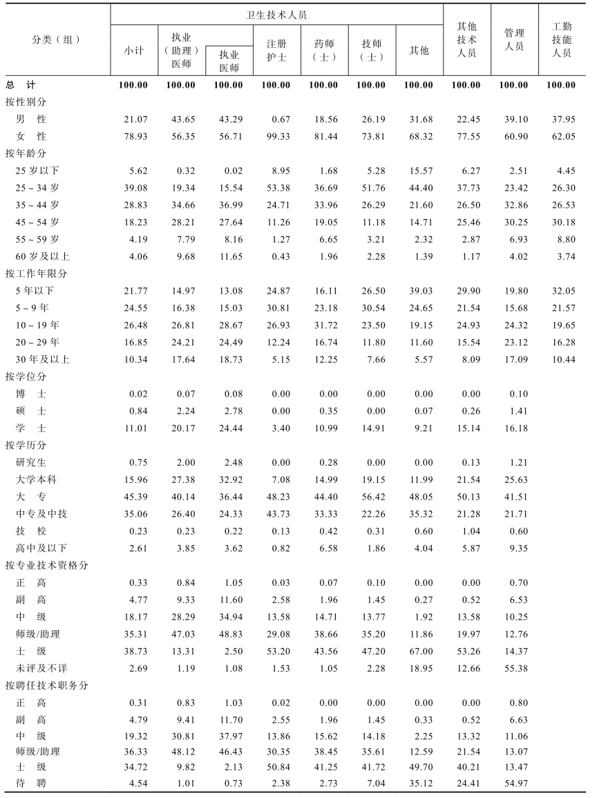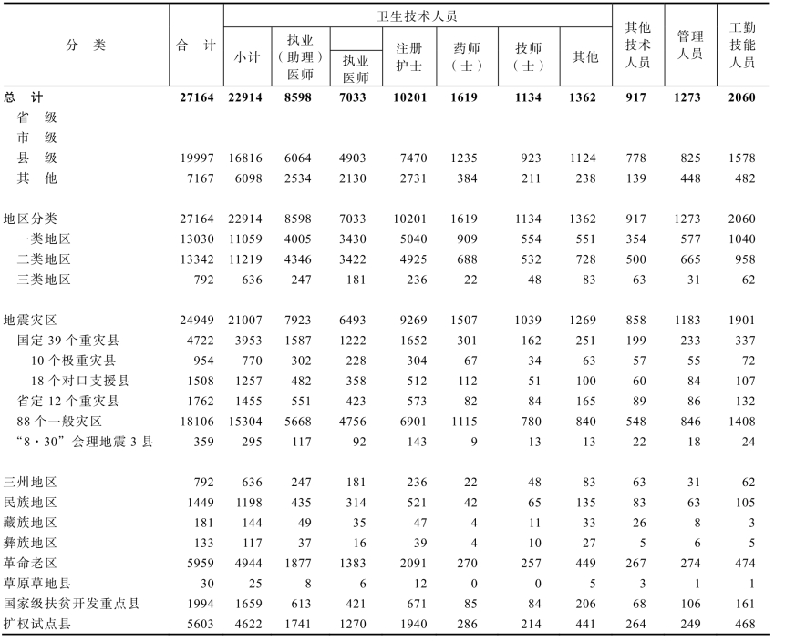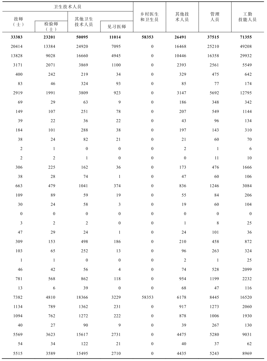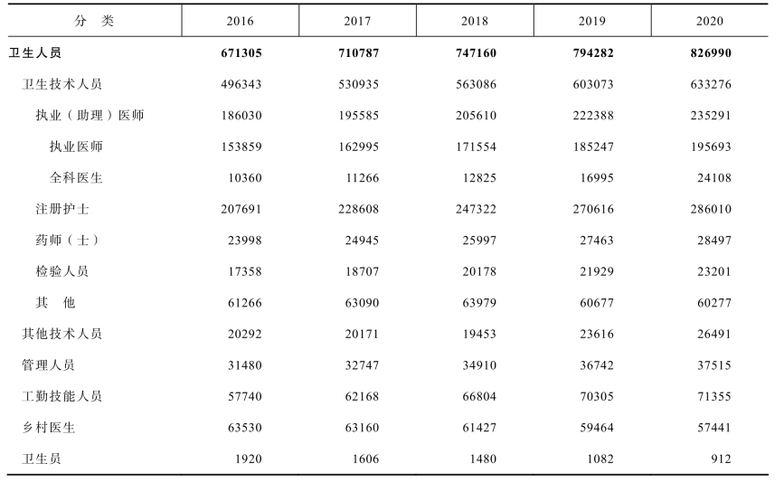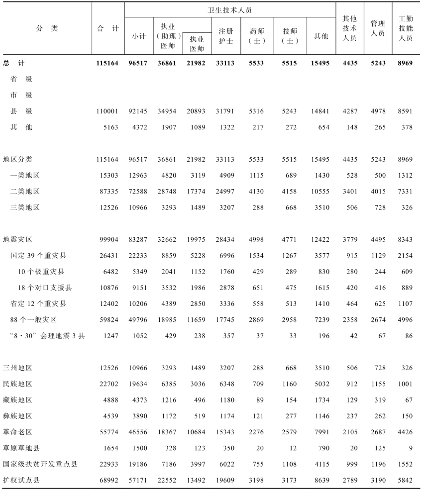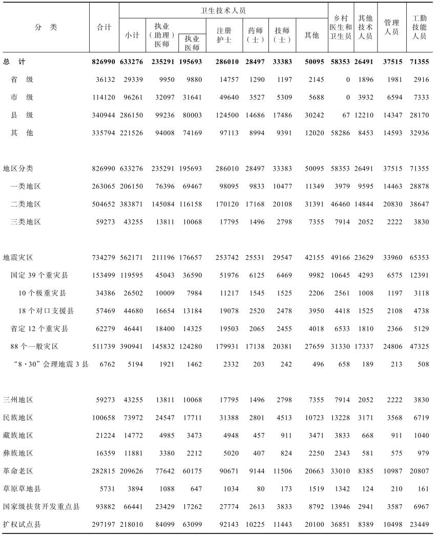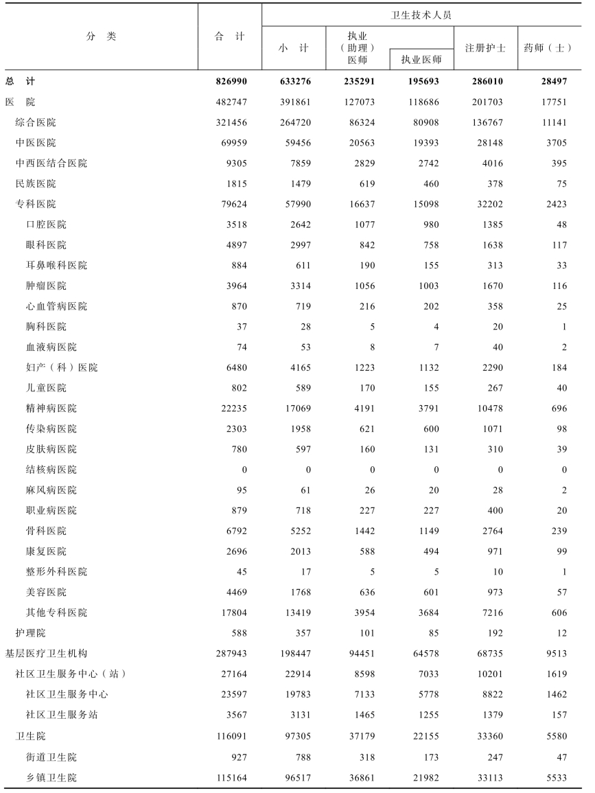注:本表按城乡及按经济类型分卫生技术人员总数中不包括乡镇卫生院在村卫生室工作的人员数(这部分人员计入乡镇卫生院中)。