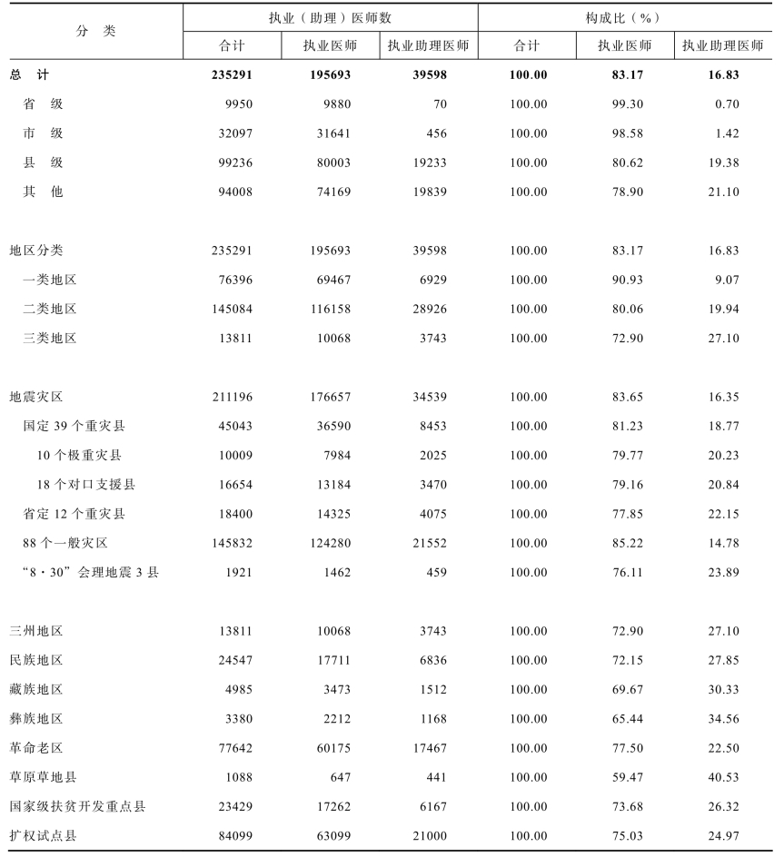 执业助理医师:具有“医师执业证”及其“级别”为“执业助理医师”且实际从事医疗、预防保健工作的人员,不包括实际从事管理工作的执业助理医师。执业助理医师类别分为临床、中医、口腔和公共卫生四类。