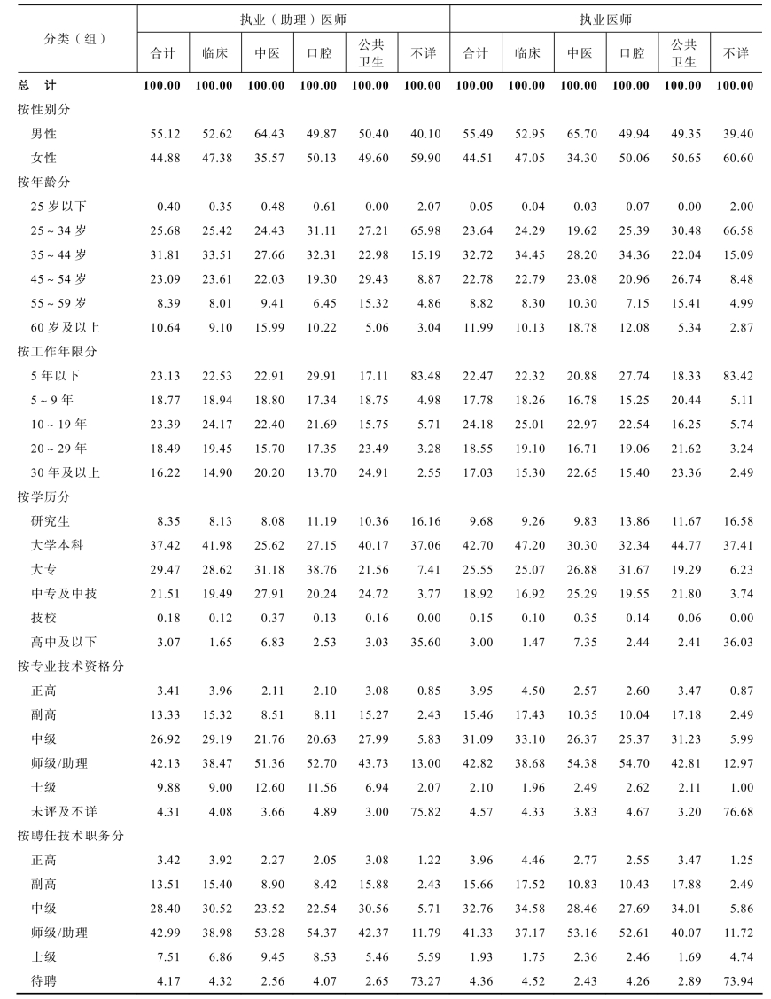 表2-3-1 2020年全省执业(助理)医师性别、年龄、工作年限、学历及职称构成(%)