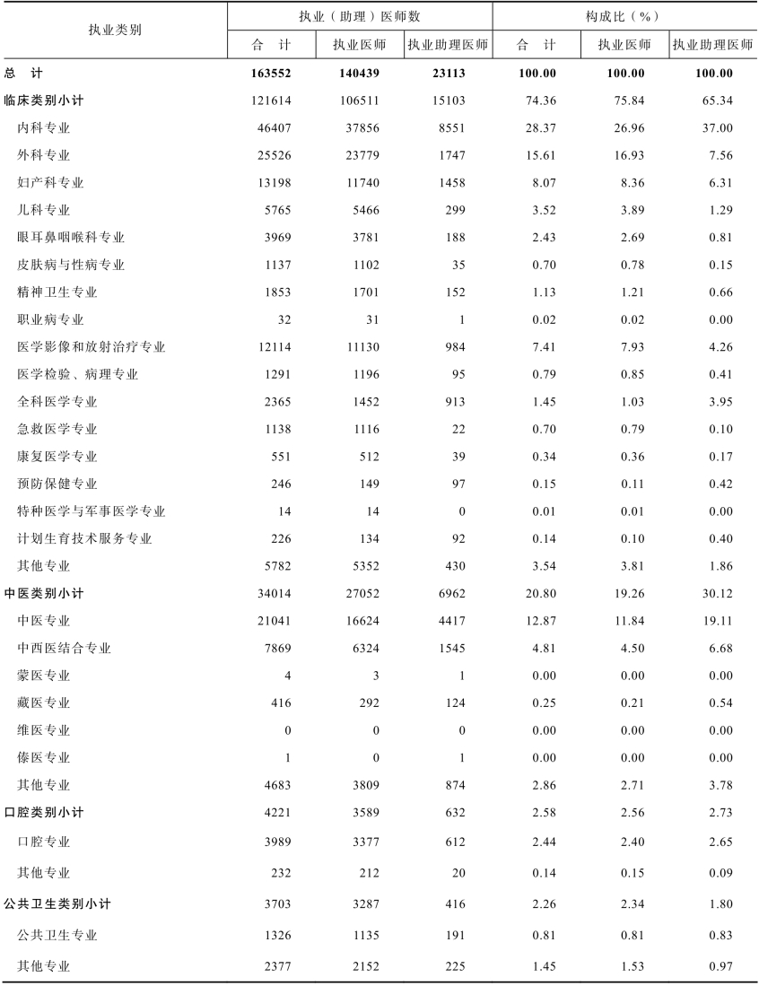 表2-3-2 2020年全省不同执业类别执业(助理)医师数及构成