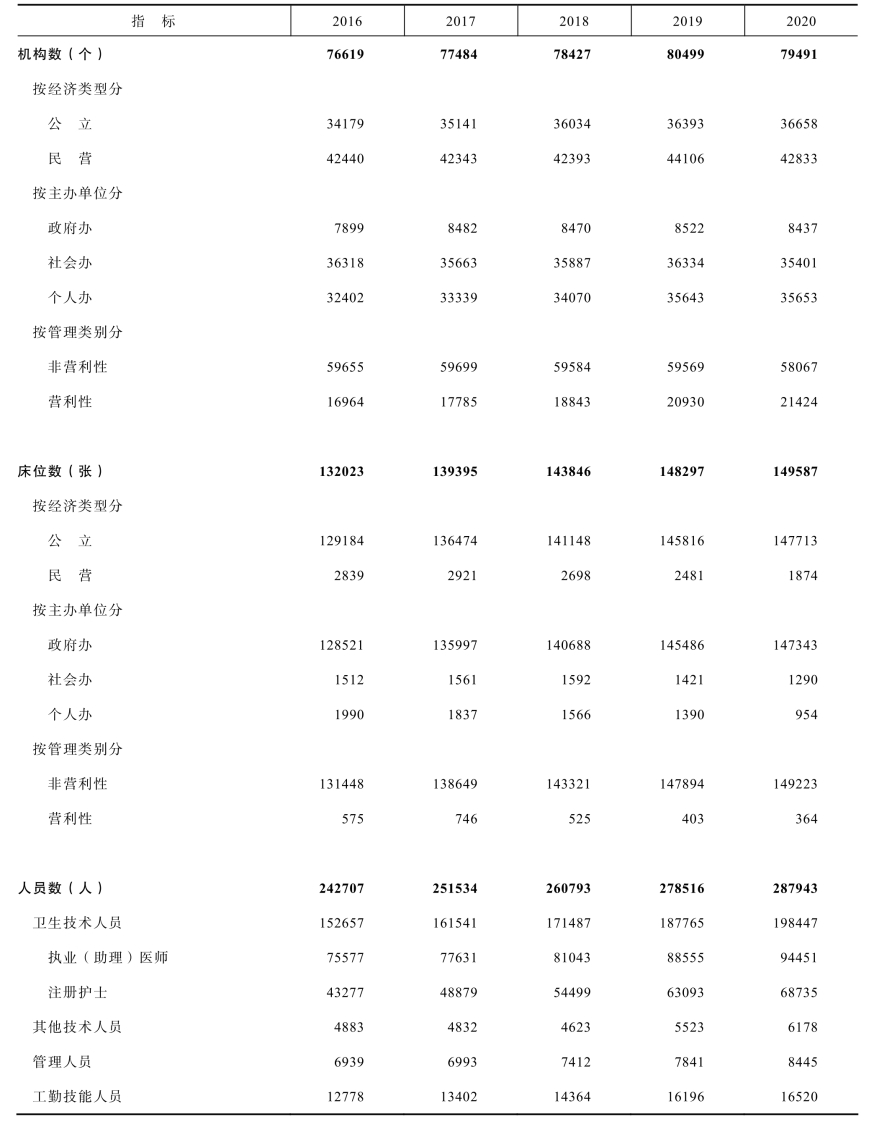 表6-1-1 2016—2020年基层医疗卫生机构、床位、人员数