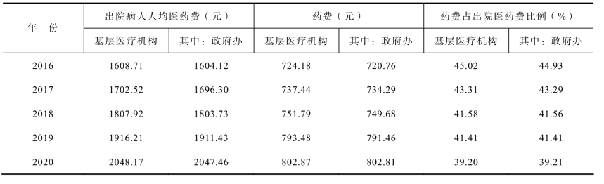 表6-1-5 2016—2020年基层医疗机构出院病人人均医药费用