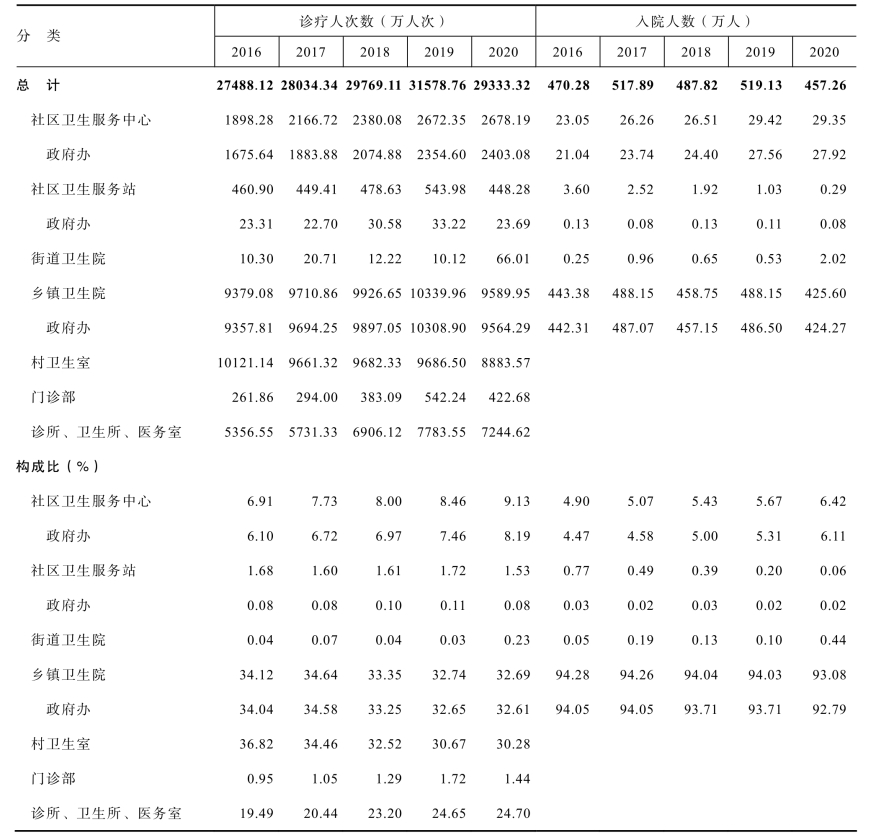 表6-1-2 2016—2020年基层医疗卫生机构诊疗人次和入院人数