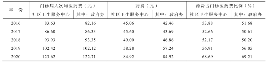 表6-2-5 2016—2020年社区卫生服务中心门诊病人次均医药费用