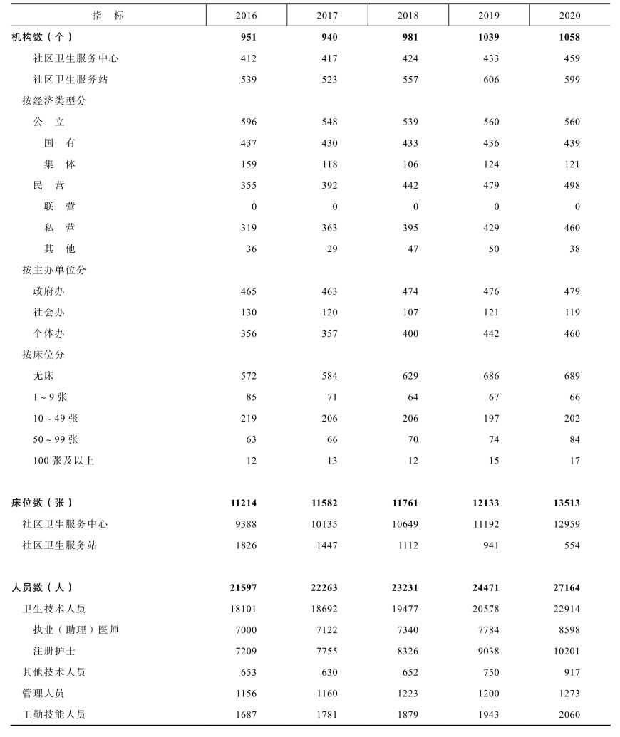 表6-2-1 2016—2020年社区卫生服务机构、床位、人员数