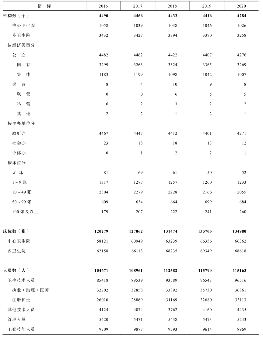 表6-4-2 2016—2020年全省乡镇卫生院医疗服务及病床使用情况