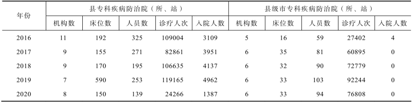 表6-8 2016—2020年县及县级市专科疾病防治院(所、站)工作情况